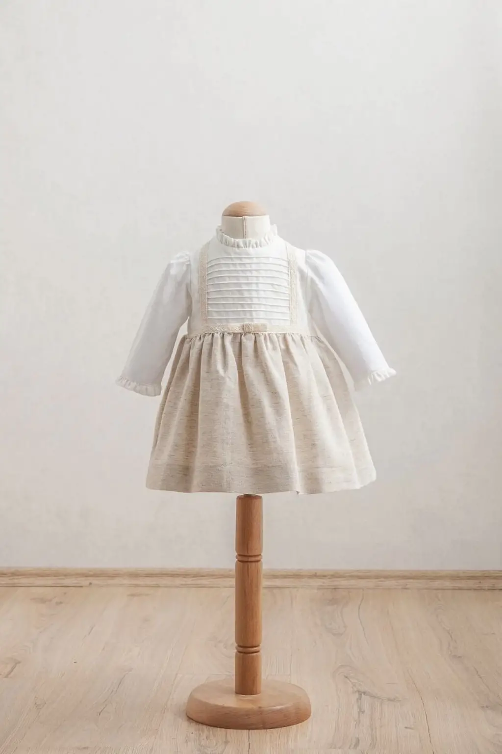 Pudra ve Bej rengin zarifliğiyle tasarlanan bu kız bebek elbisesi, modern çizgileri ve şık detaylarıyla dikkat çekiyor.