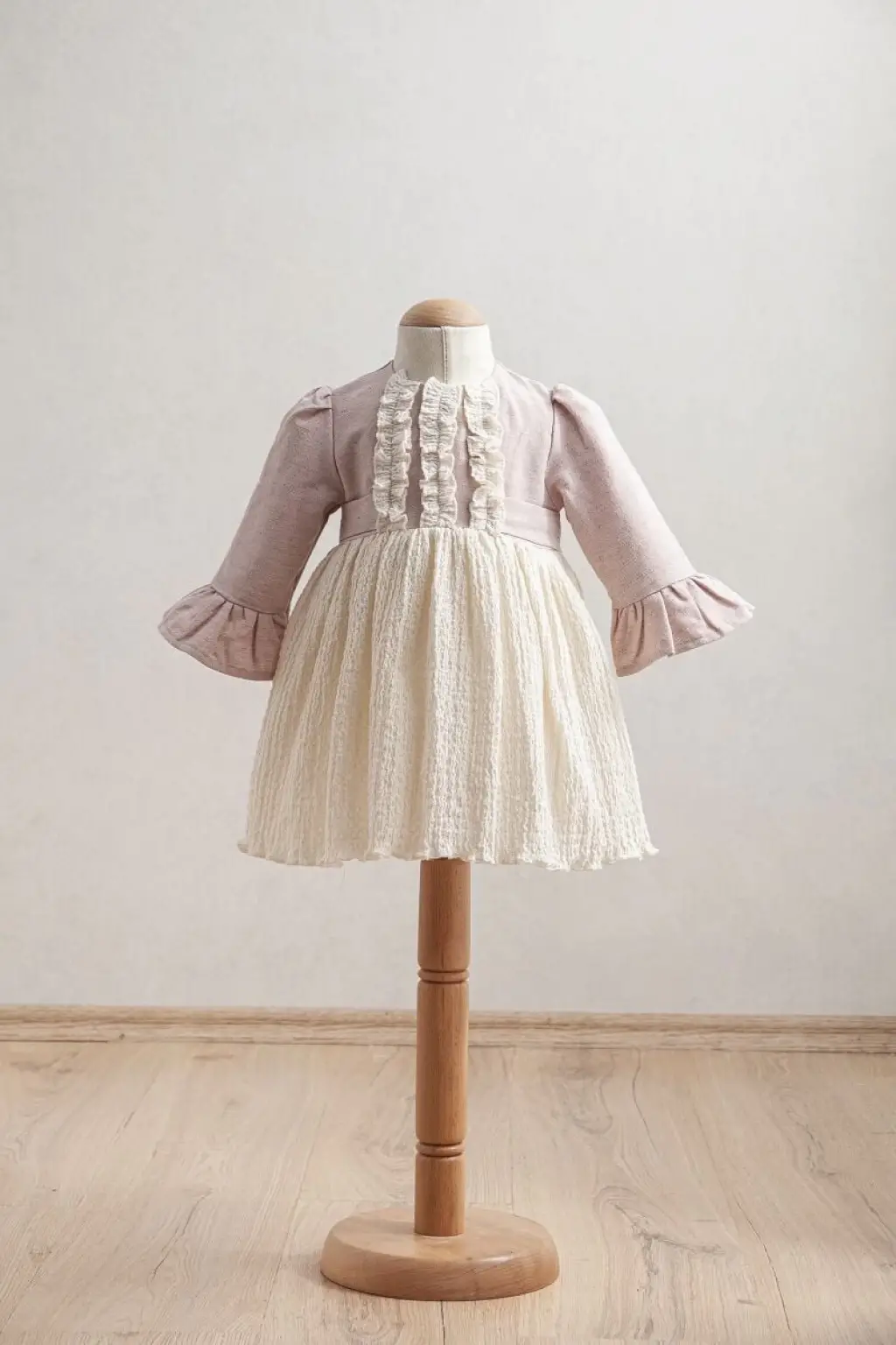 Bu kız bebek elbisesi, bej rengin zarif sadeliği ve dokulu tasarımıyla hem şıklığı hem de konforu bir araya getiriyor.