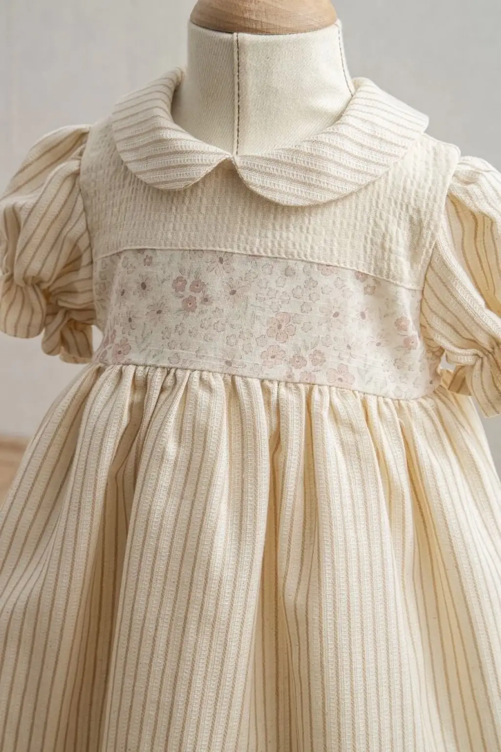 Hafif ve nefes alabilen %100 pamuk kumaş Şık Peter Pan yakalı tasarım Ön kısımda zarif çiçek desenli dantel detaylar İnce çizgili vintage tarzı kumaş Günlük kullanım ve özel günler için ideal