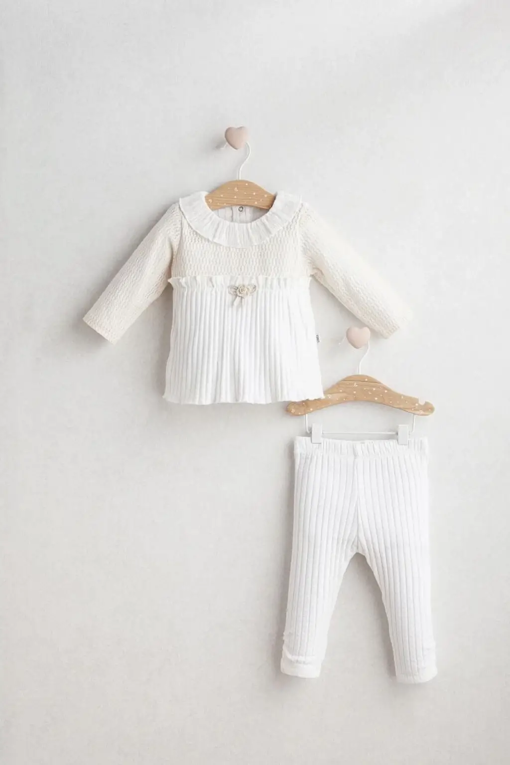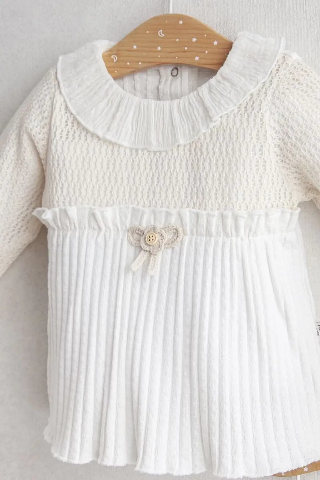 Üst Parça: Bebe yaka tasarımı, örgü dokulu üst bölüm ve fiyonk detayı ile öne çıkar. Ahşap düğme süslemeleri, zarafeti tamamlar.