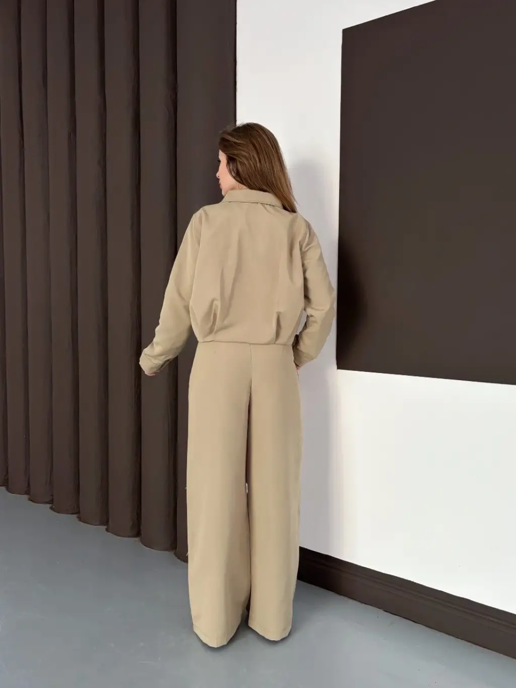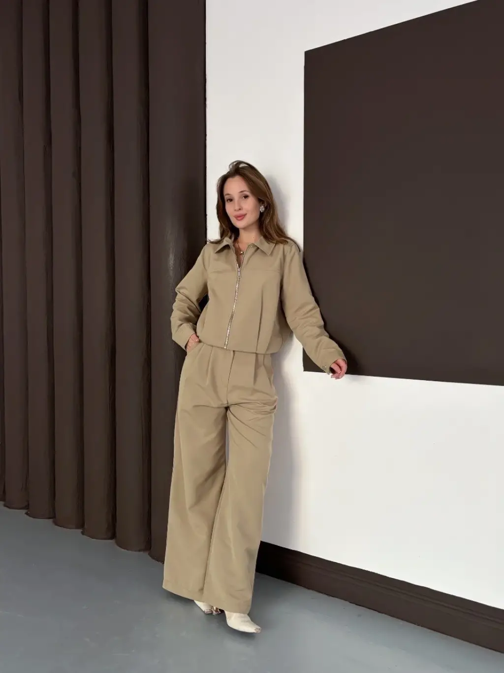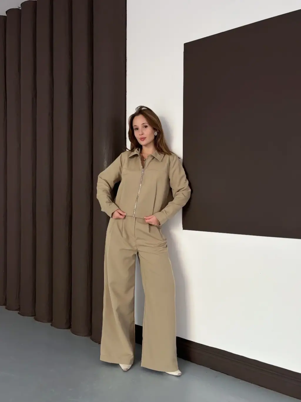 Renkli ve şık bir kombin için Trenç Takım Alt Üst Haki Ons!