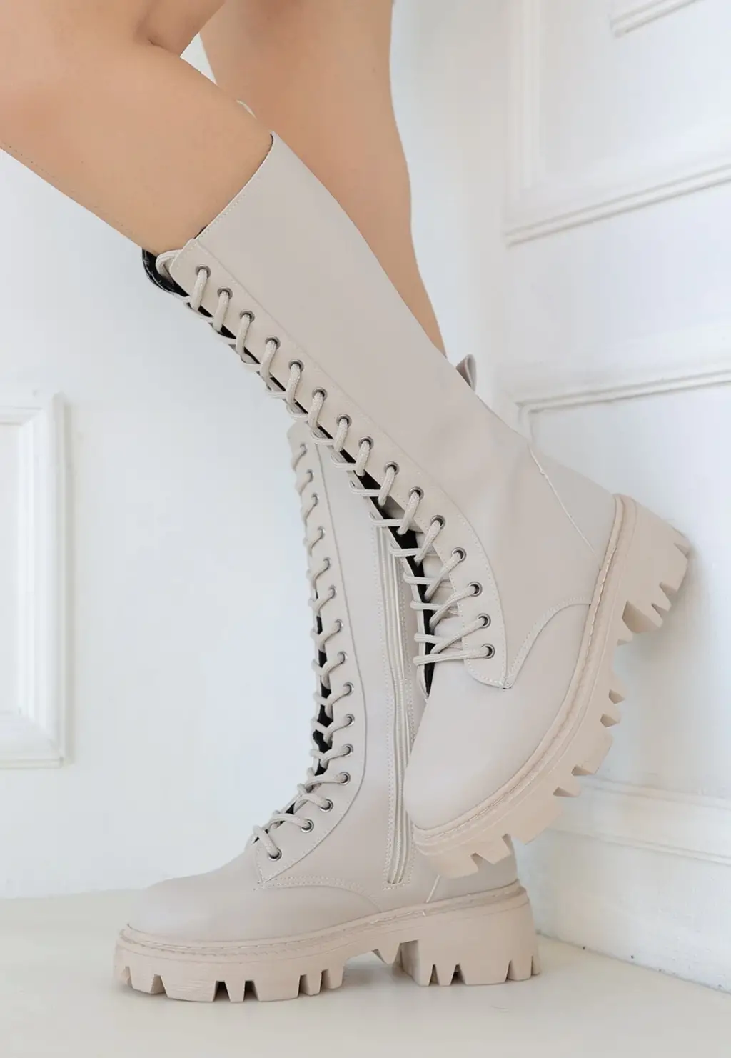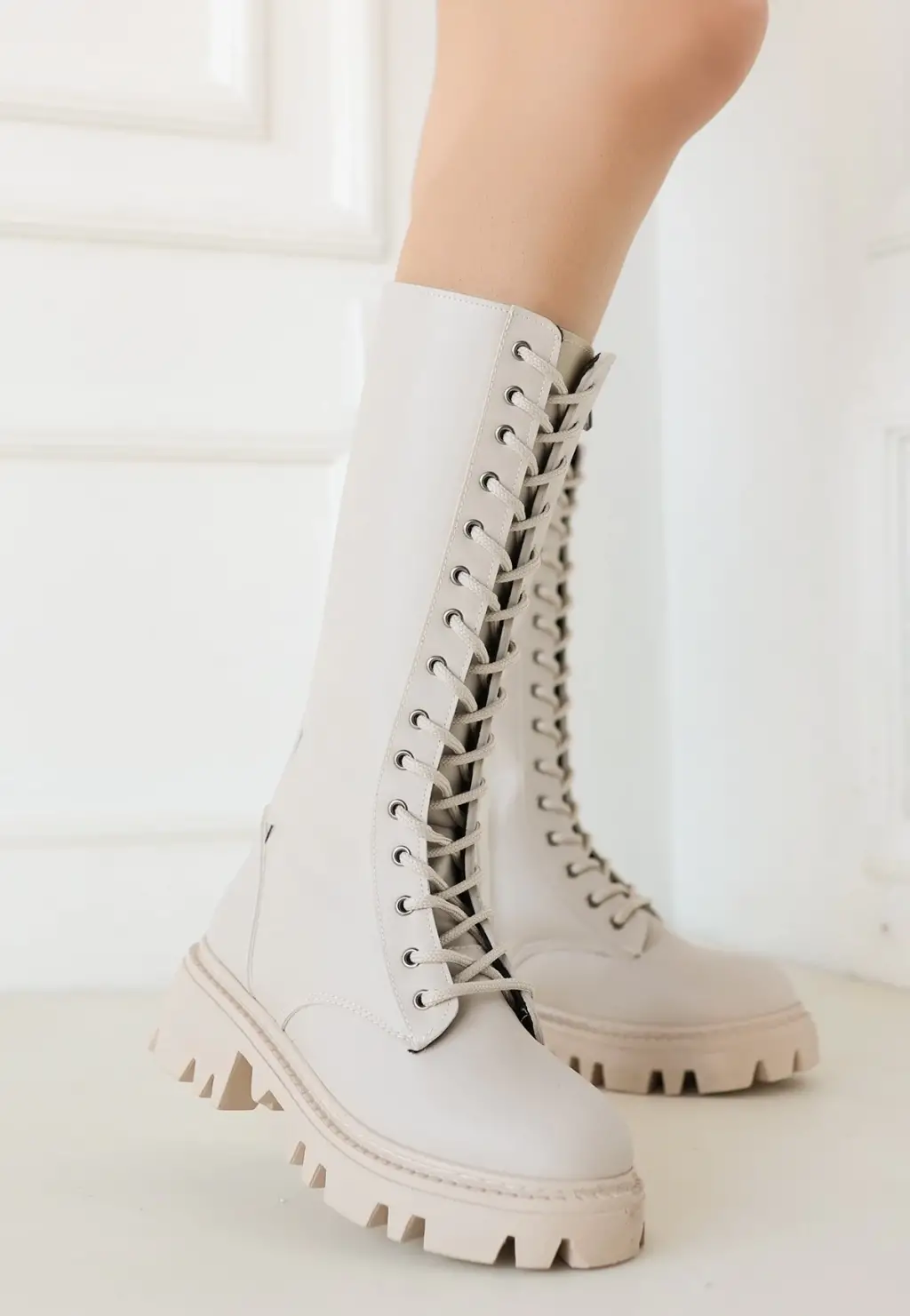 Omarı Göz Alıcı Bej Bağcıklı Çizme