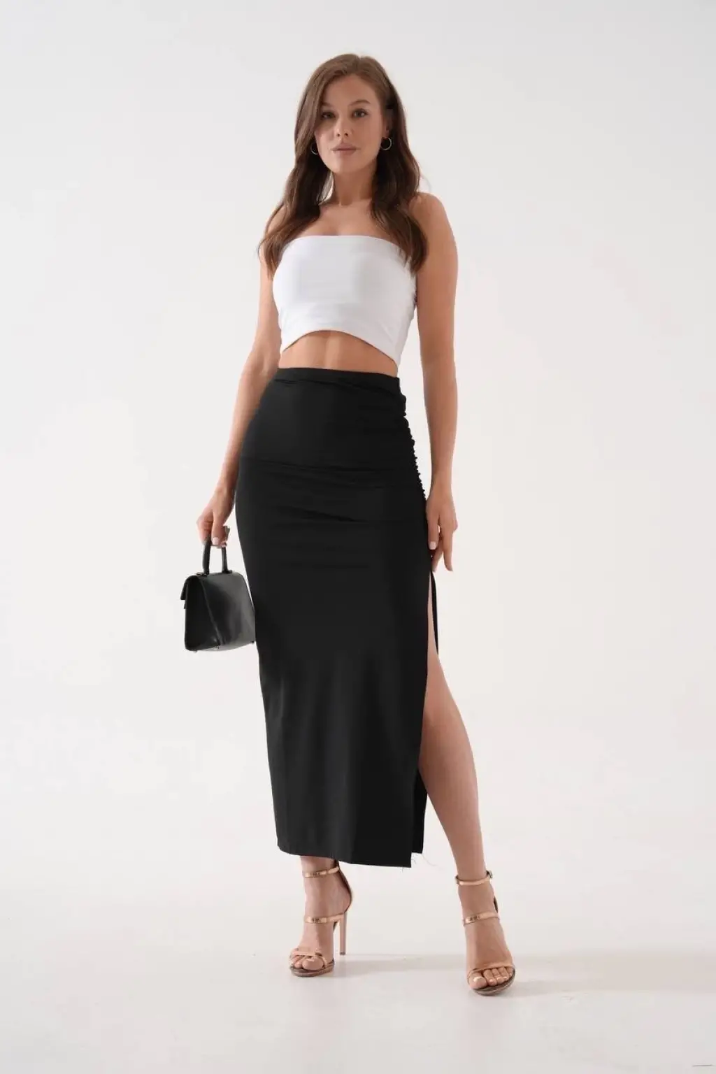 Omarı Siyah İnce Kumaş Uzun Etek - Yırtmaç Detaylı Moda Parçası