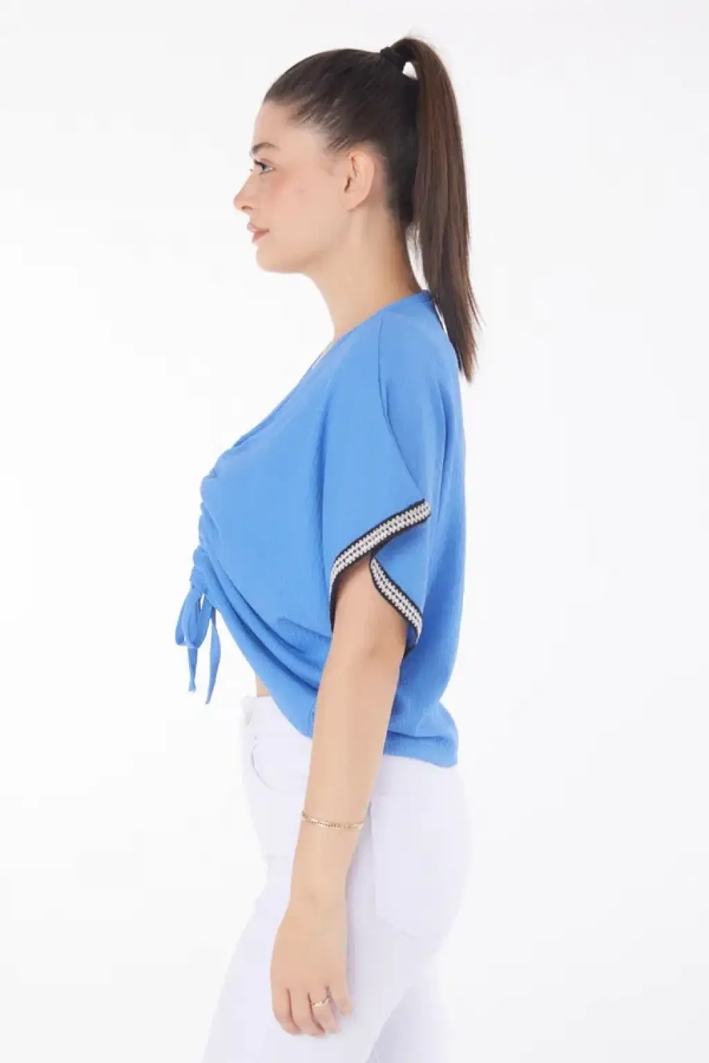 Büzgülü detayları, bluza hareketlilik katar.