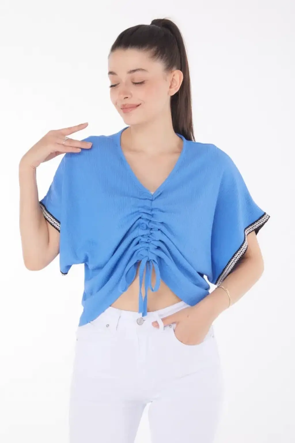 KAZAX markasının şıklığı ve rahatlığı bir araya getiren V yaka büzgülü detaylı bluz, gardırobunuzun vazgeçilmezi olmaya aday.