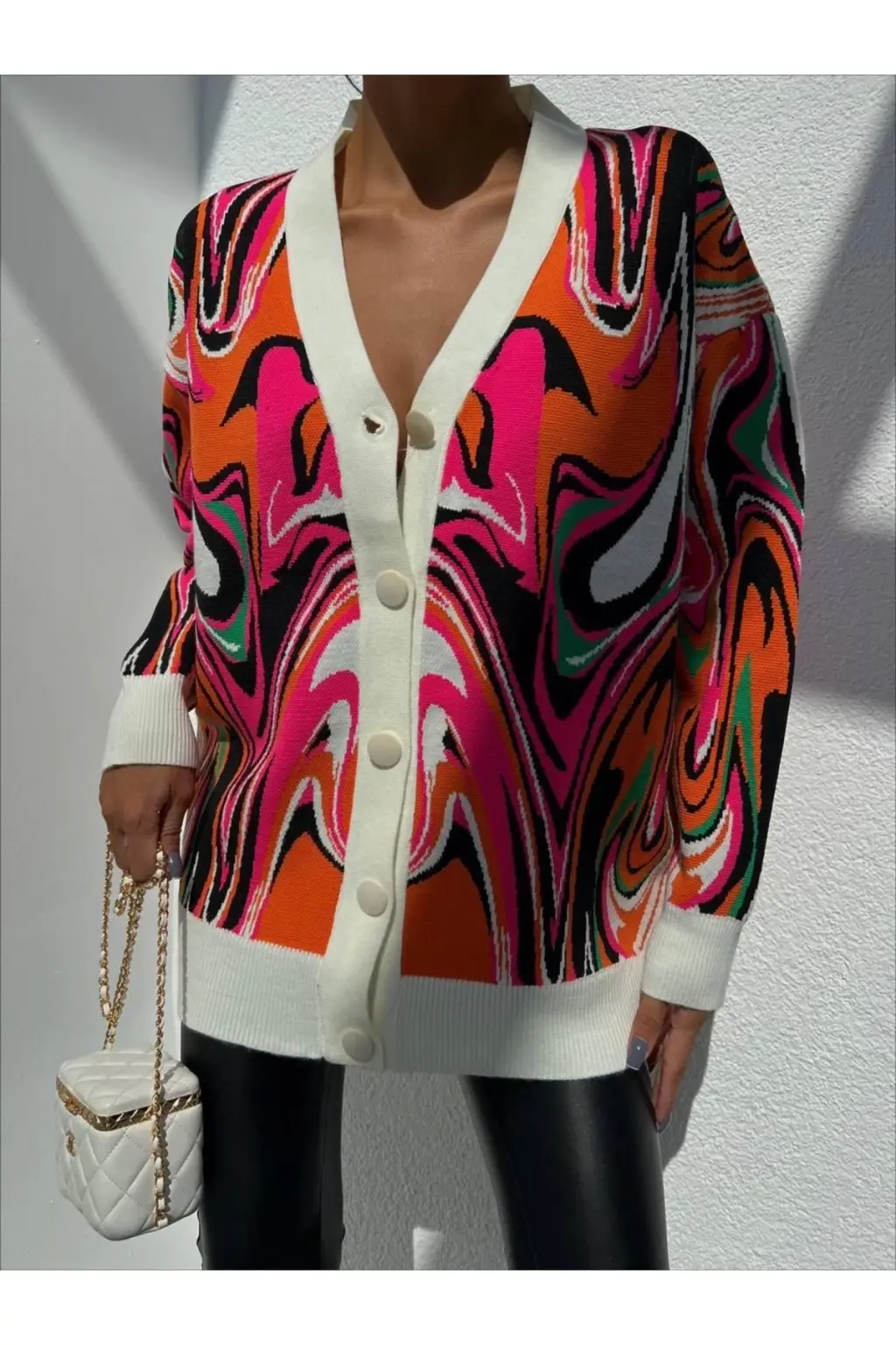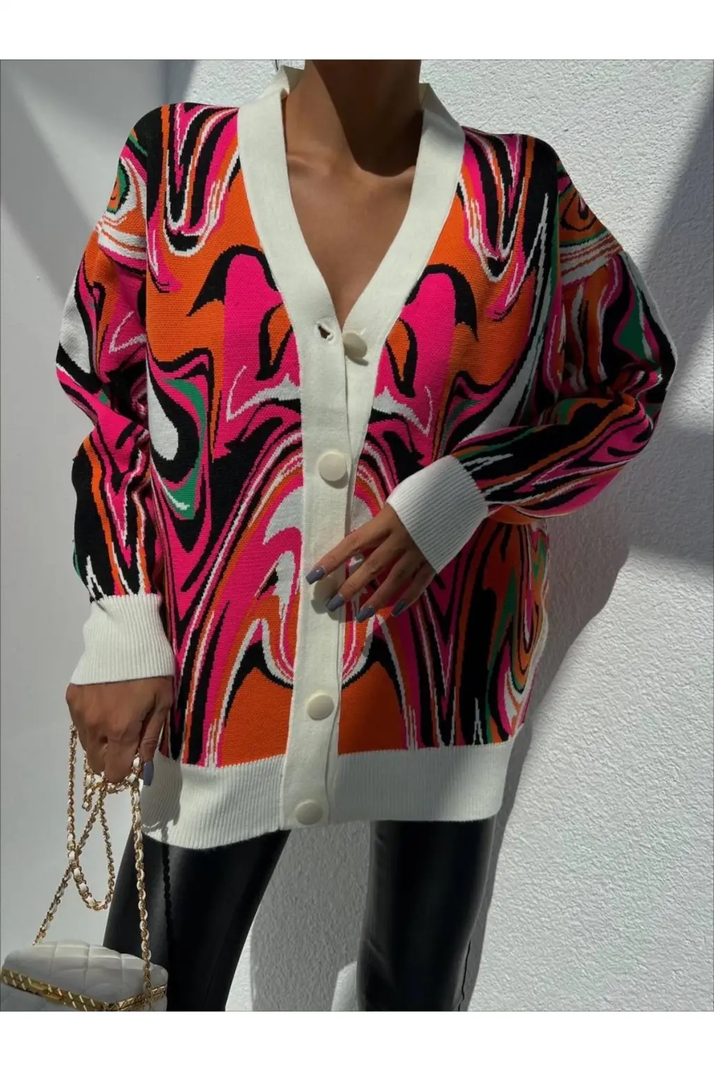 V Yaka Düğmeli Oversize Ebruli Desen Hırka