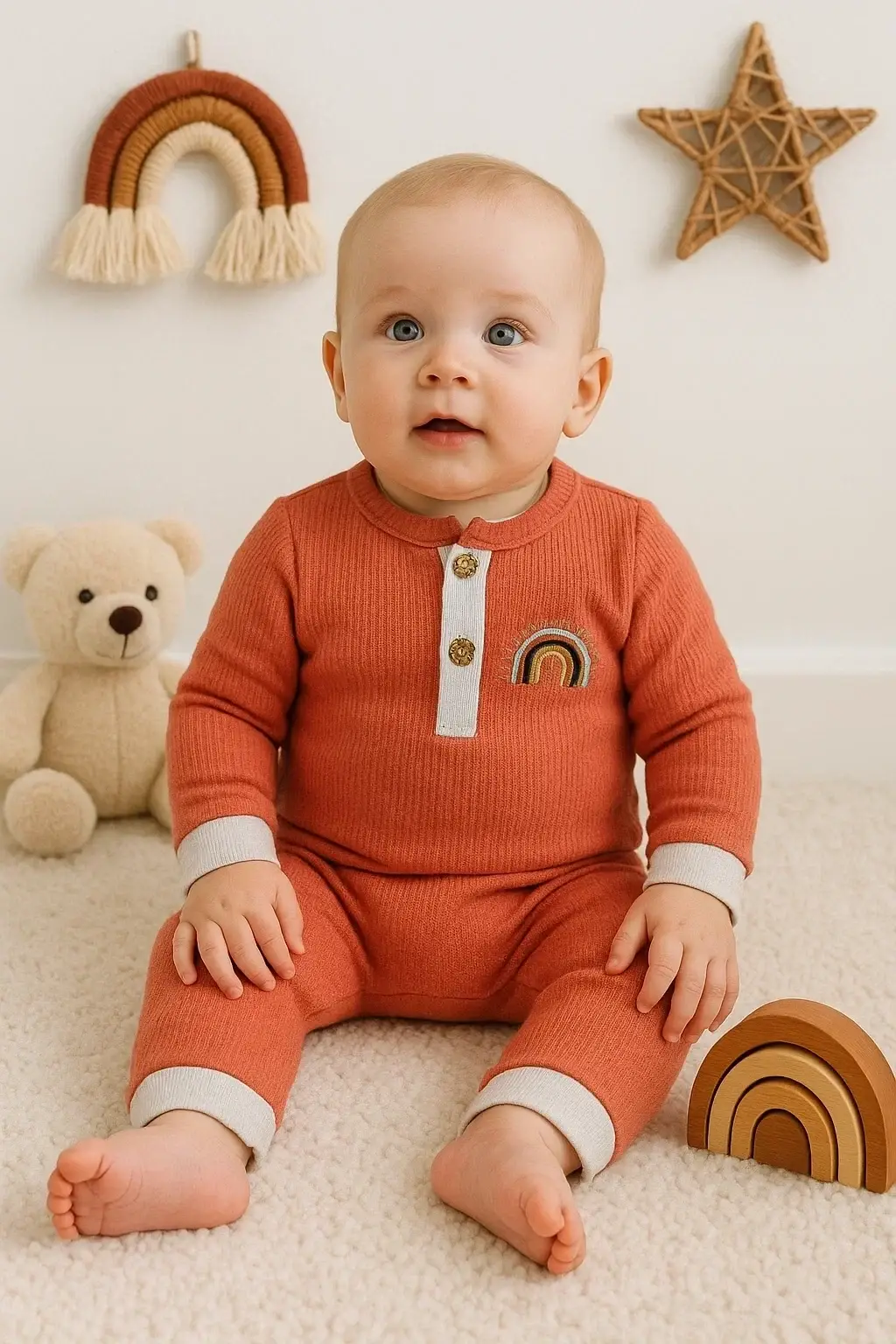 Waffle Gökkuşağı Nakışlı Erkek Bebek Tulumu