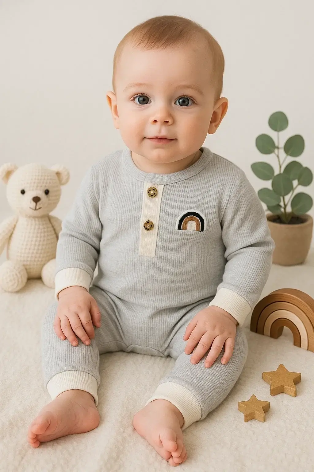 Waffle Gökkuşağı Nakışlı Erkek Bebek Tulumu