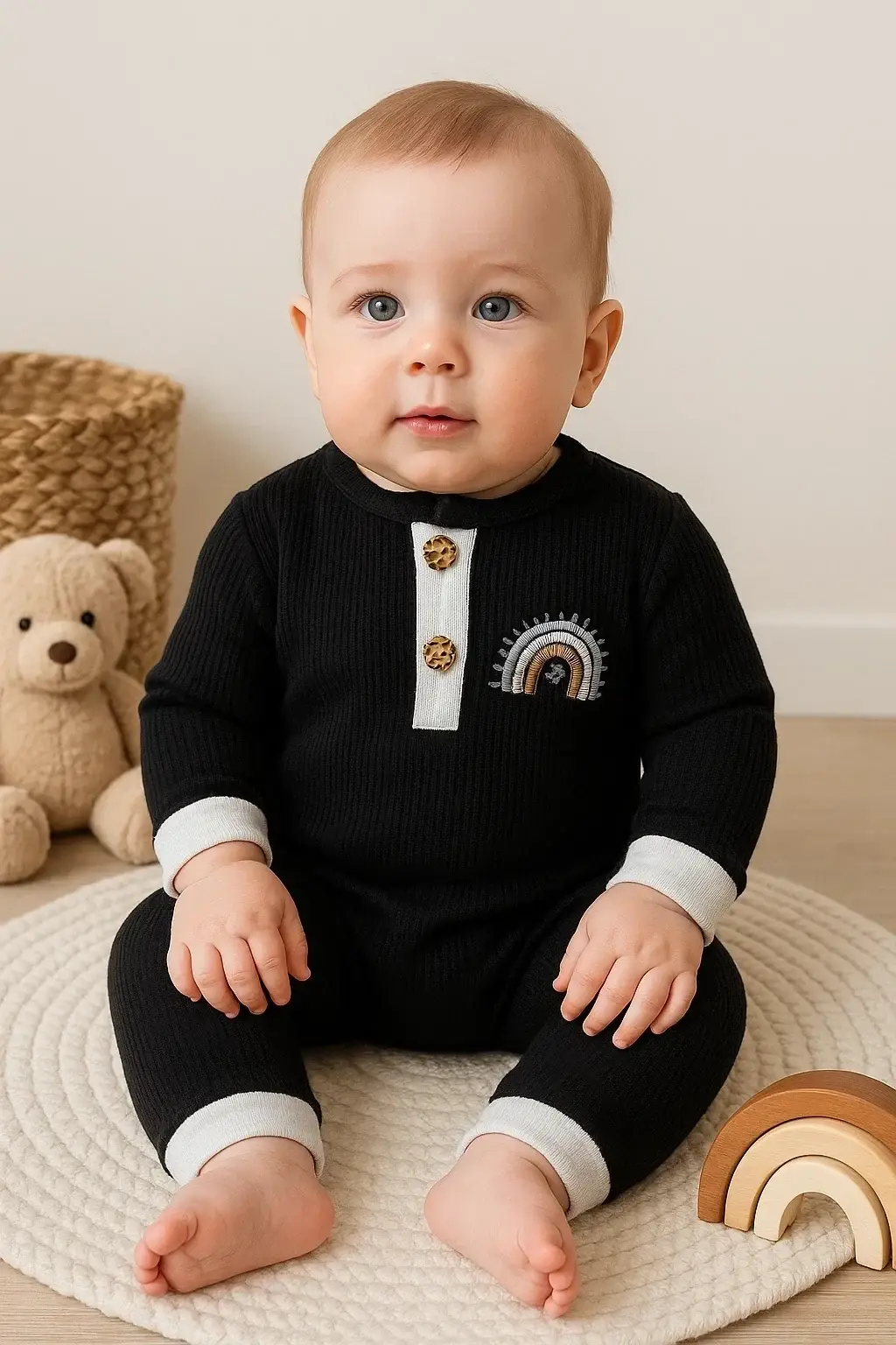 Waffle Gökkuşağı Nakışlı Erkek Bebek Tulumu