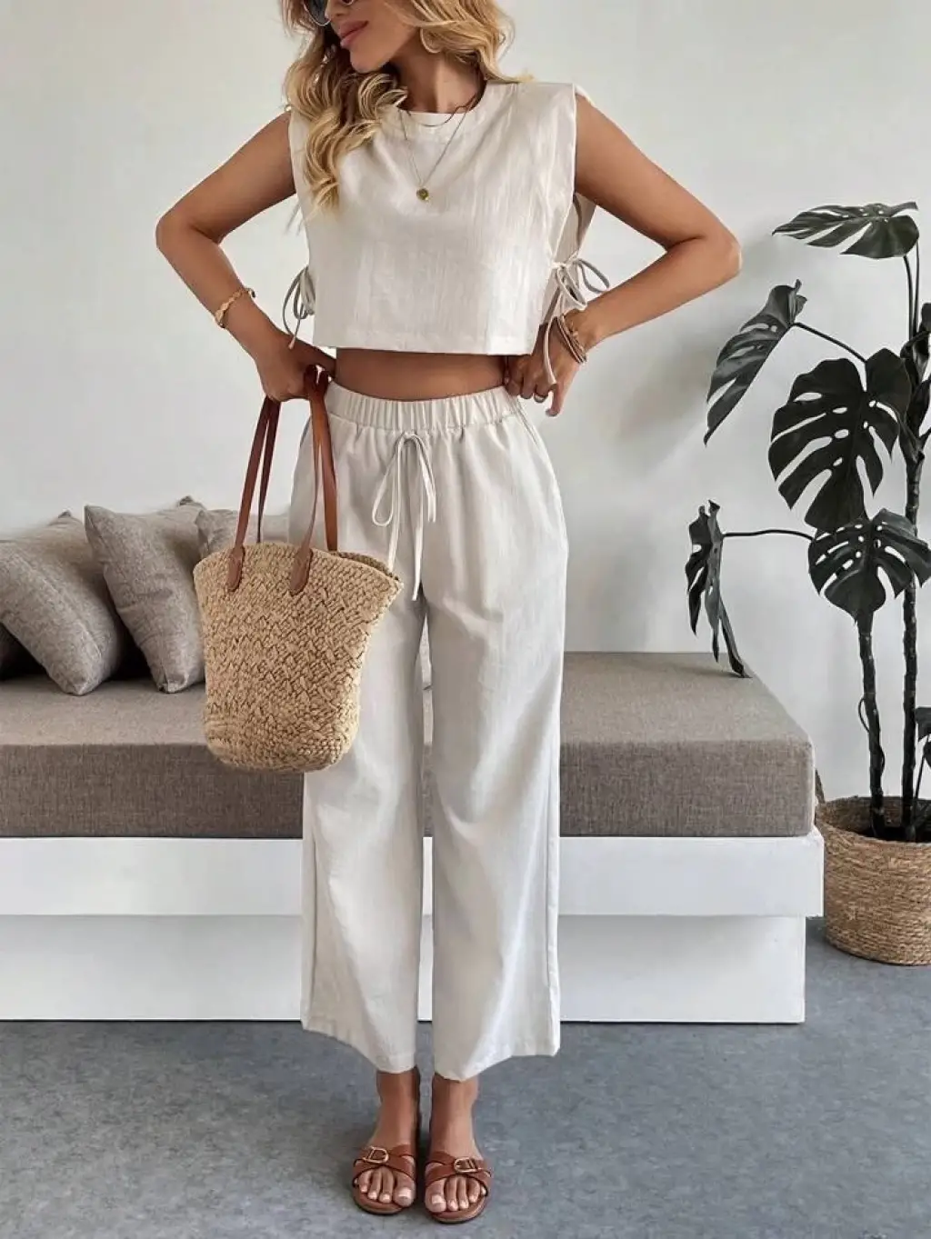Yan bağlama detaylı pantolonlu takım bej, zarif ve şık bir seçenektir. Tarzınızı yansıtmak için ideal bir tercihtir.