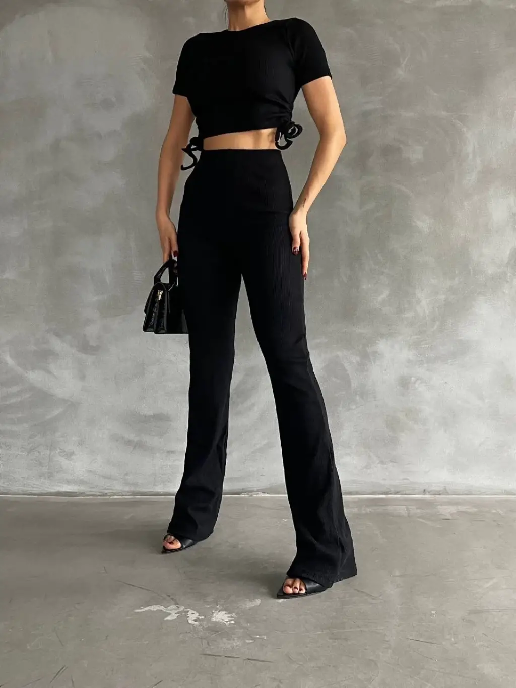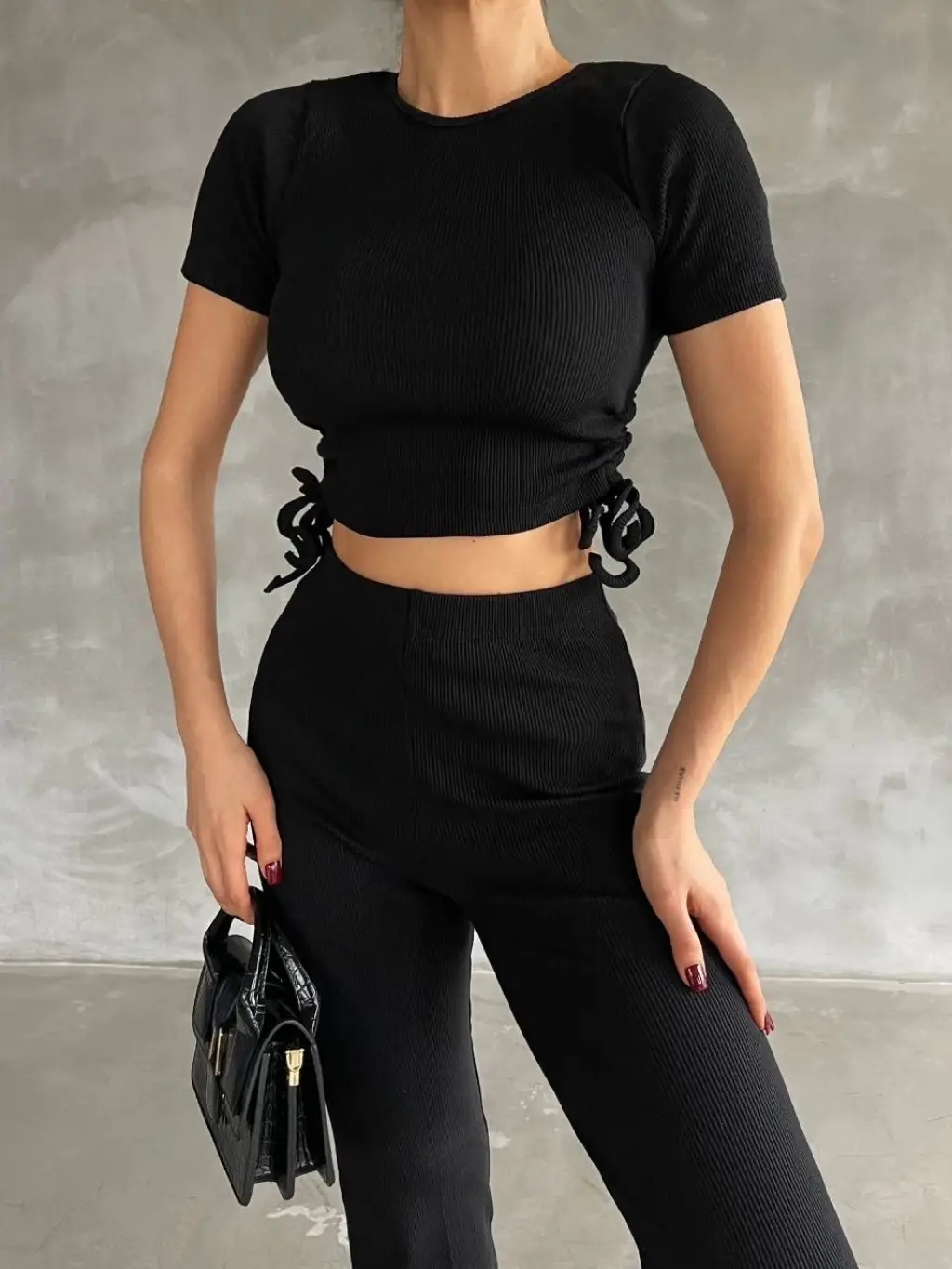 Yanları tünel detaylı pantolonu, uyumlu bluzu ile kombin tamamlar.