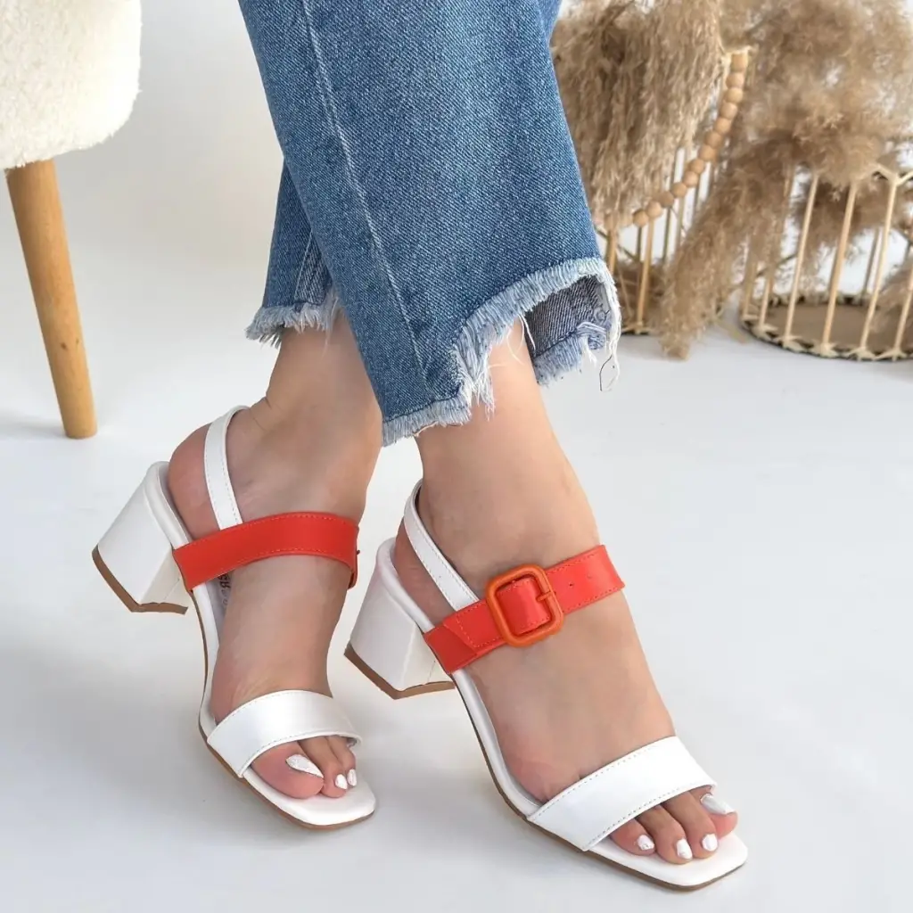 Year Beyaz Cilt Turuncu Detaylı Beyaz Topuklu Ayakkabı