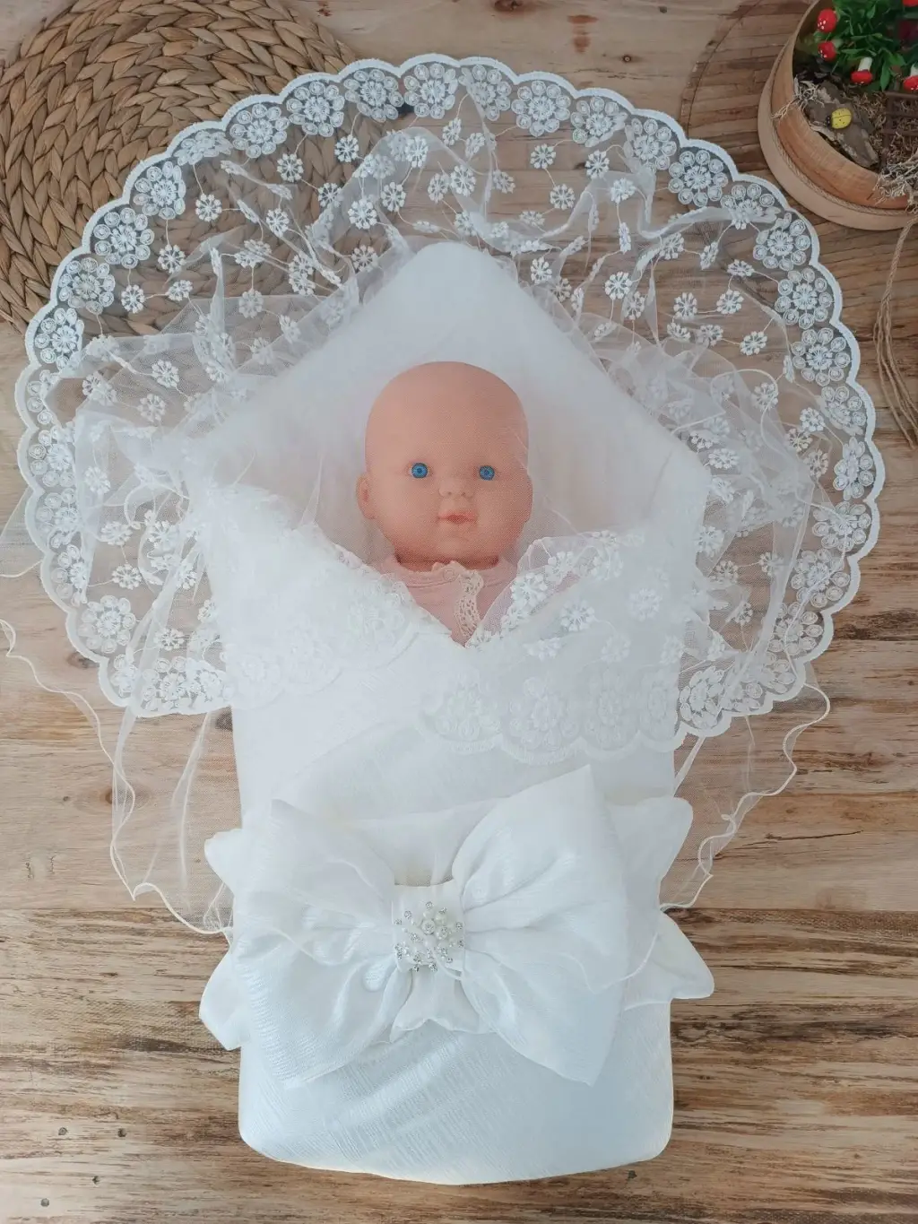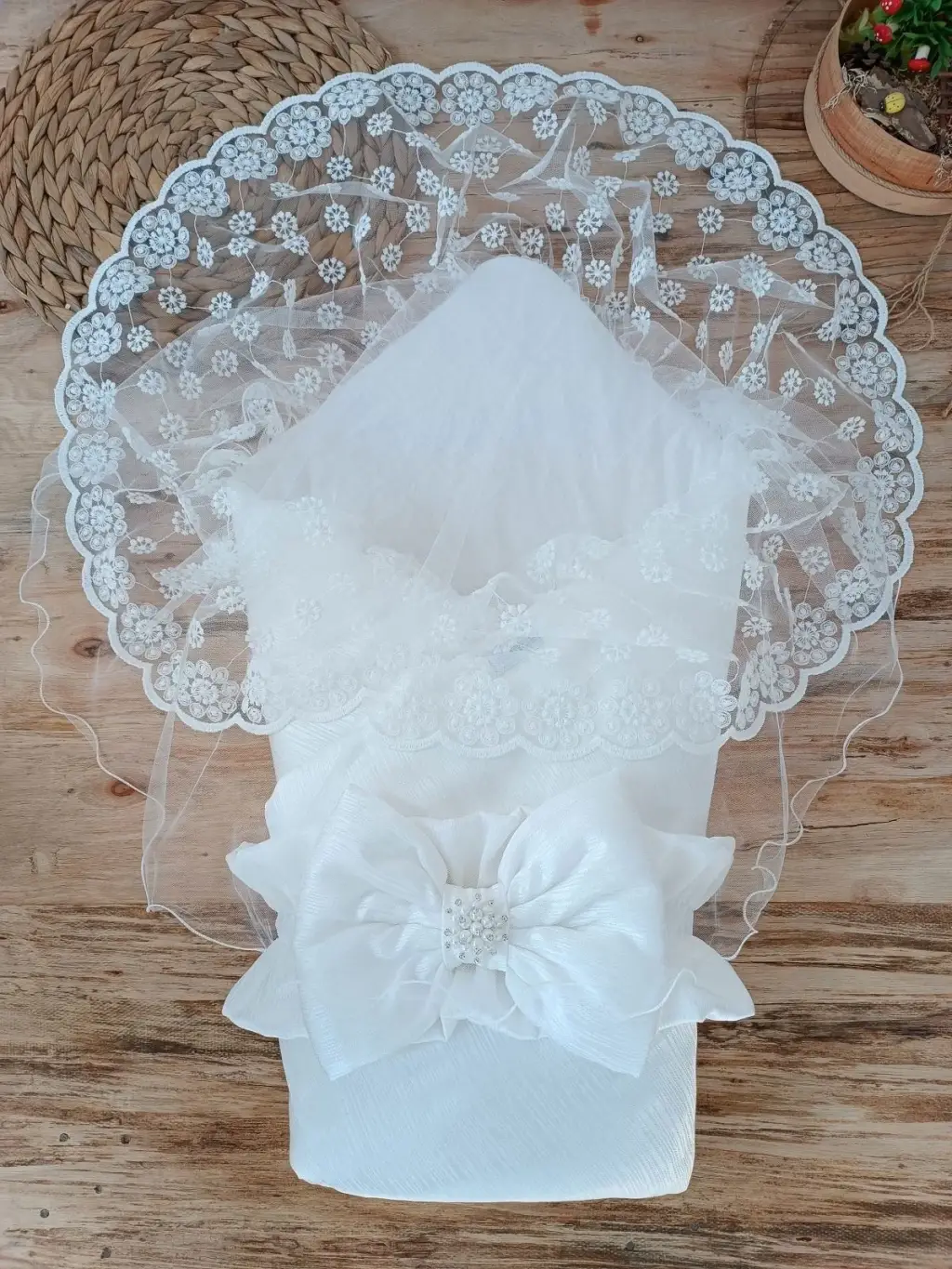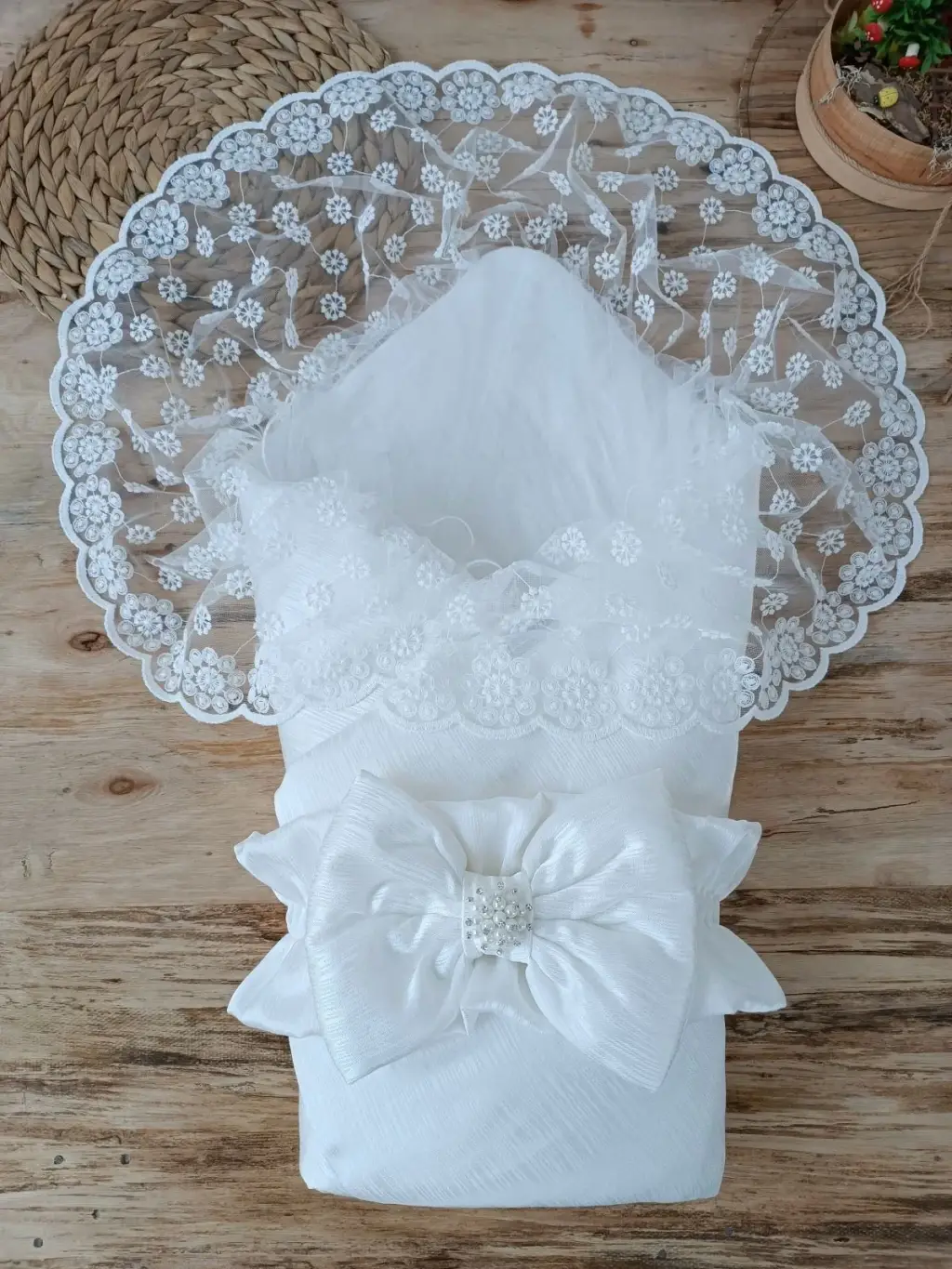 Yenidoğan Ay Işığı Papatya Dantelli Taşlı Fiyonk Bebek Battaniyesi Kundak