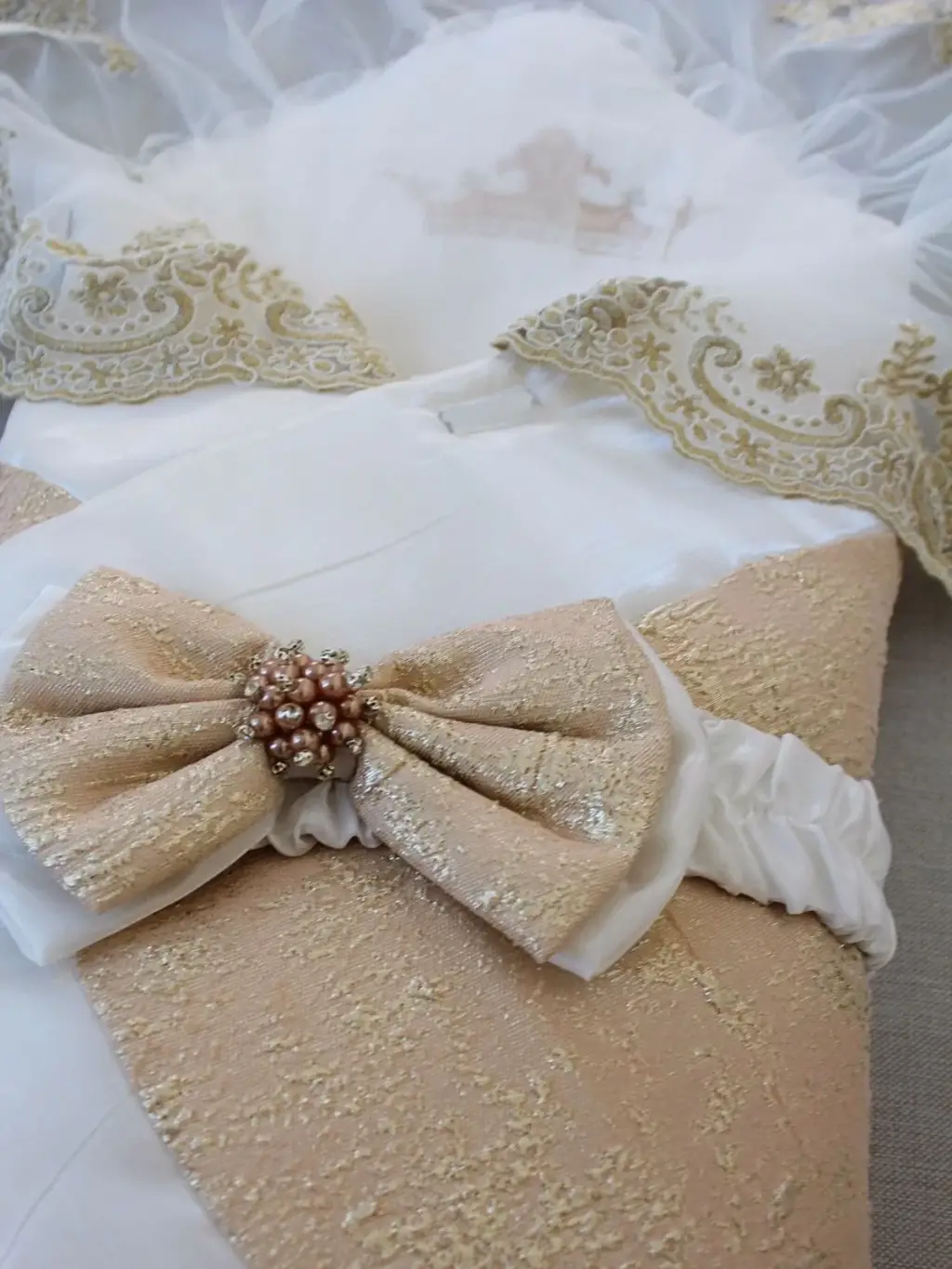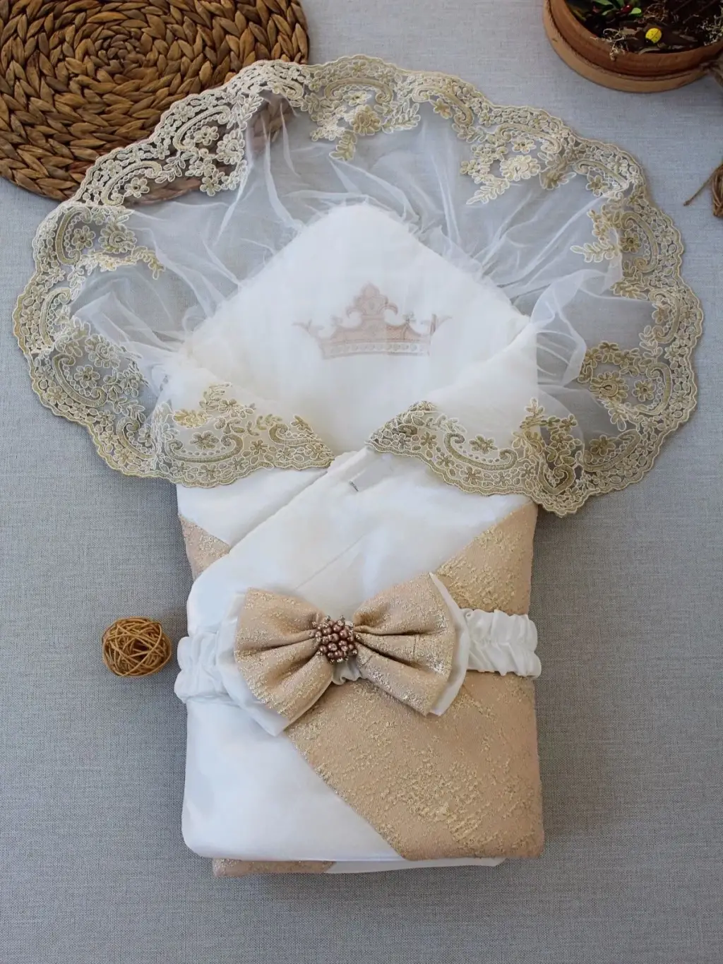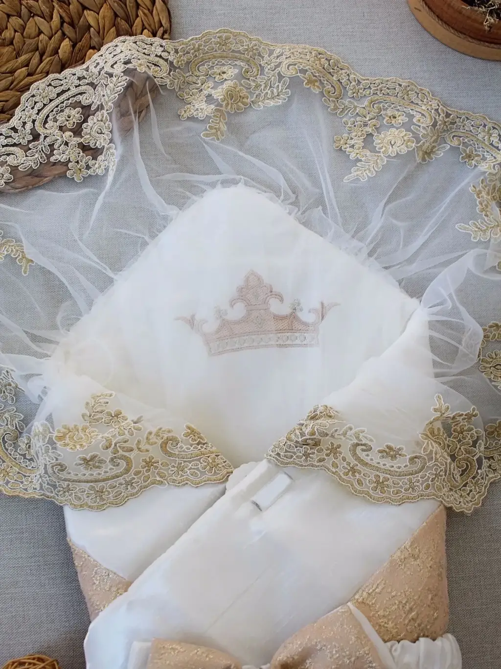 Yenidoğan Gold Zümrüt Taşlı Prizma Taç Nakışlı Lüks Duvaklı Kumru Kundak Bebek Battaniyesi