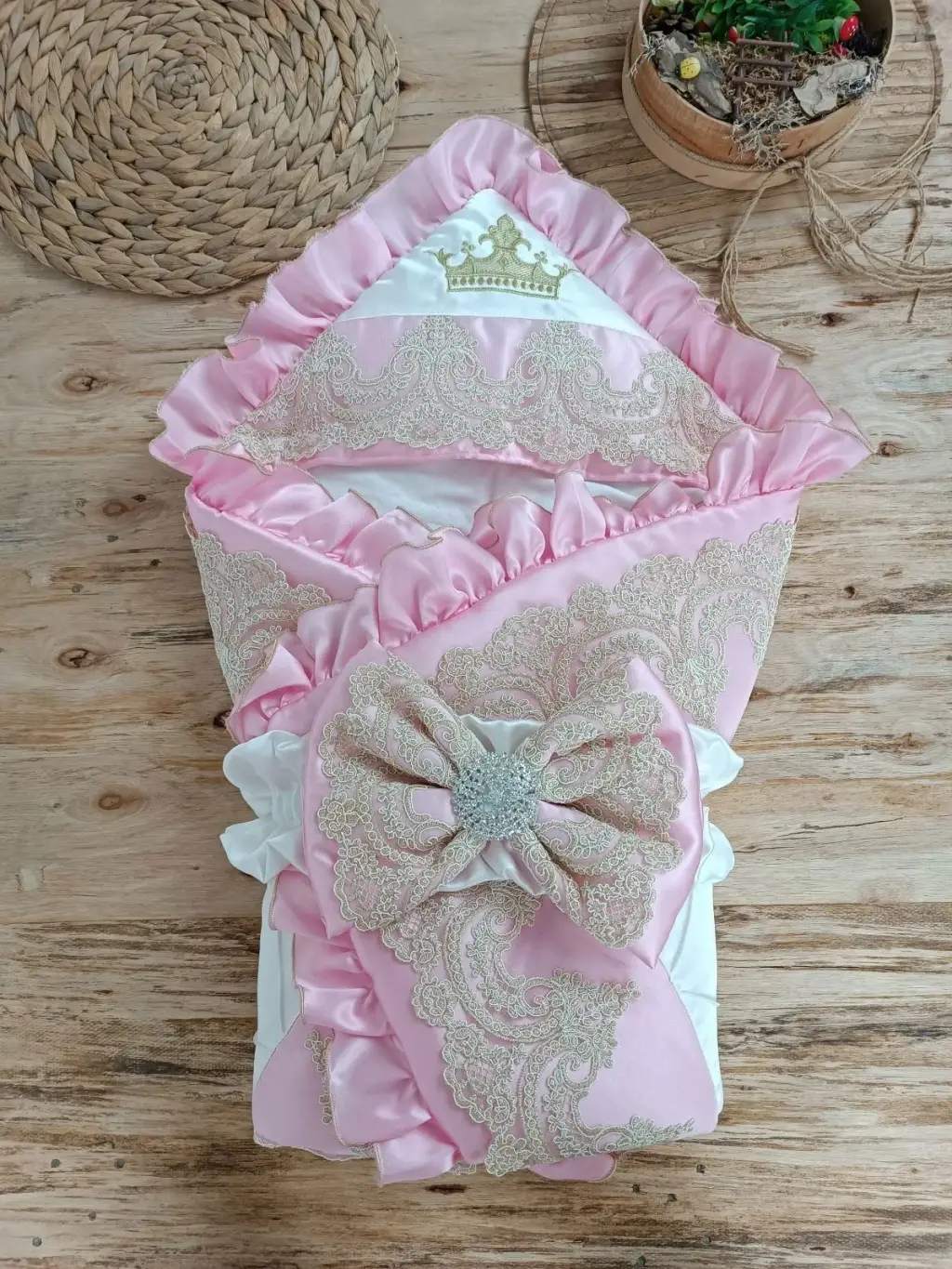 Yenidoğan Grand Lüks Kelebek Ağır Güpür İşlemeli Şapkalı Bebek Battaniyesi Kundak