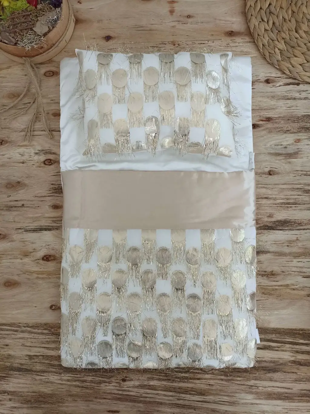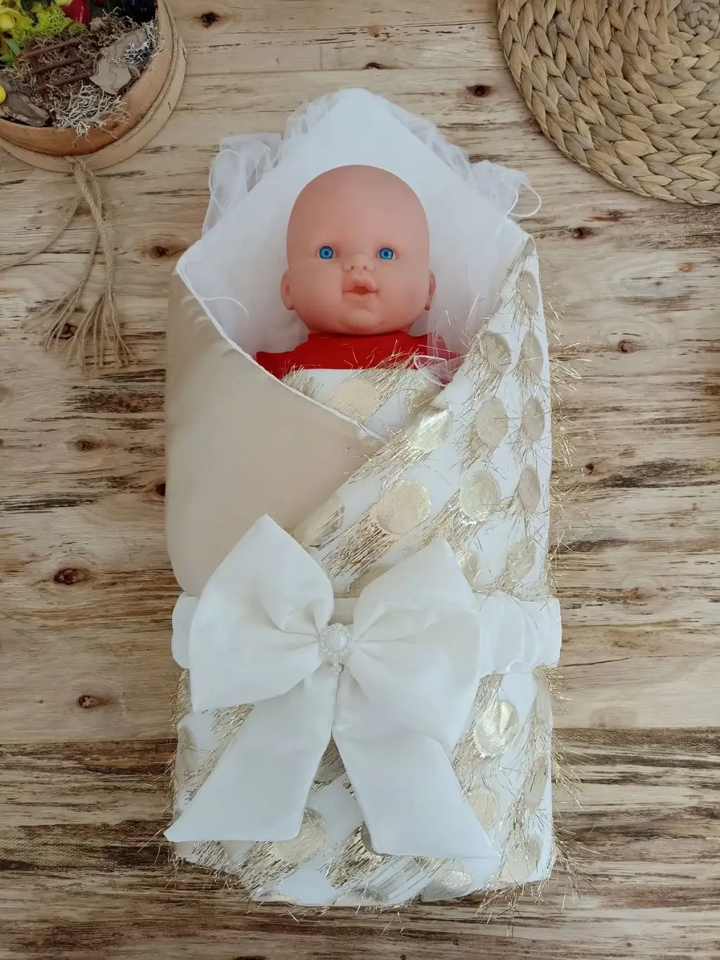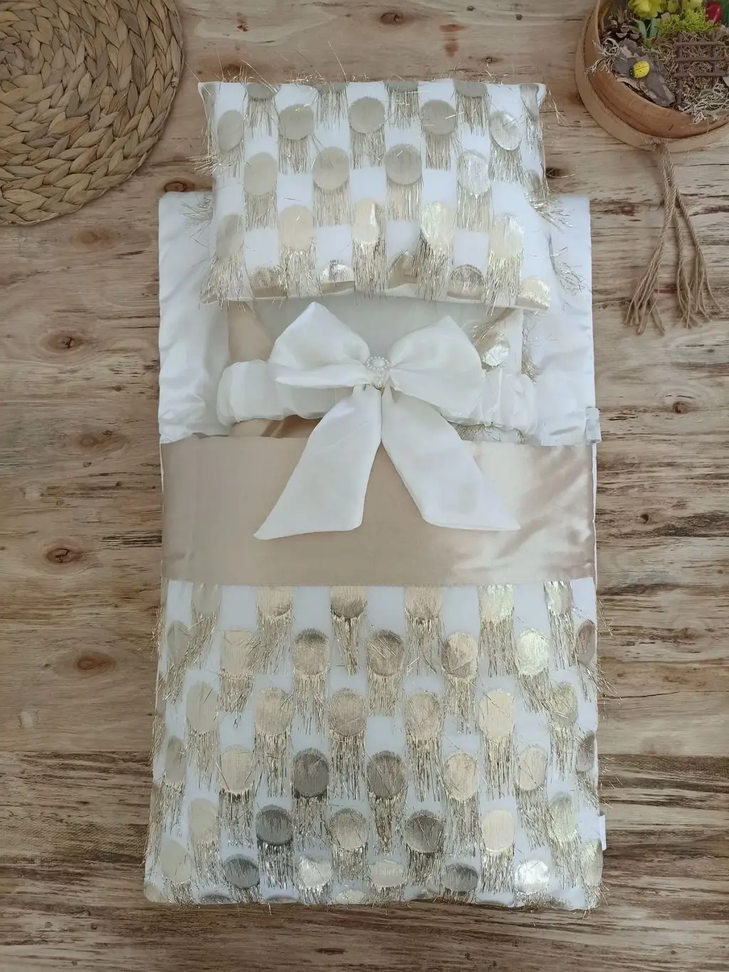 Yenidoğan İzmir İncisi Tül İşlemeli Pamuklu Fiyonklu Kundaklı Lüks 3lü Alt Açma Seti Gold