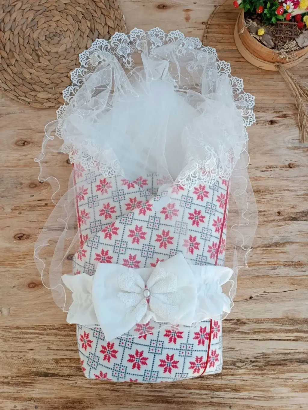 Yenidoğan Kar Tanesi Desenli Dantelli Duvaklı Bebek Battaniyesi Kundak