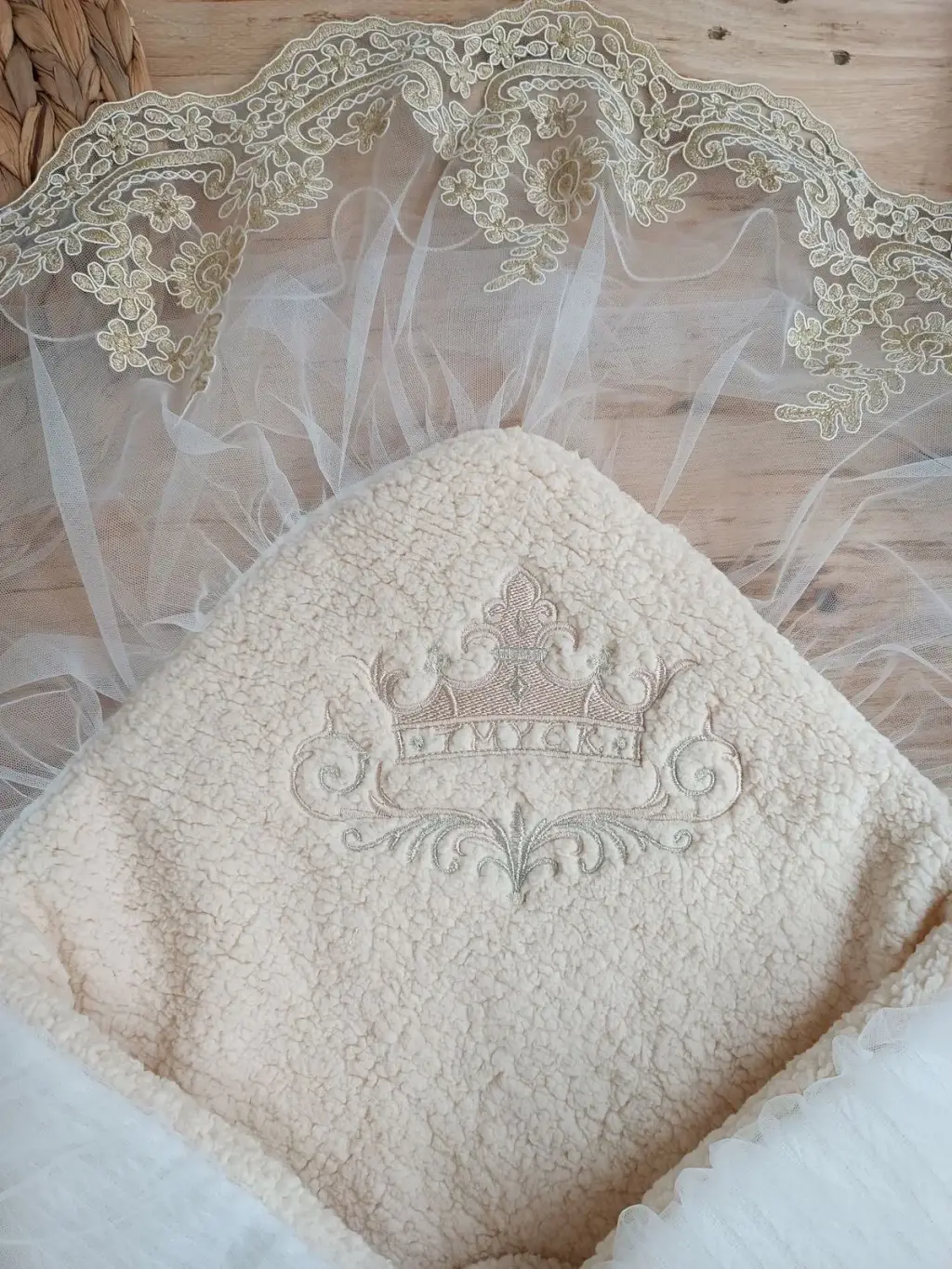 Yenidoğan Kuzulu Taç Nakış Güpürlü Fiyonklu Duvaklı Prizma Taş Unisex Kundak Bebek Battaniyesi