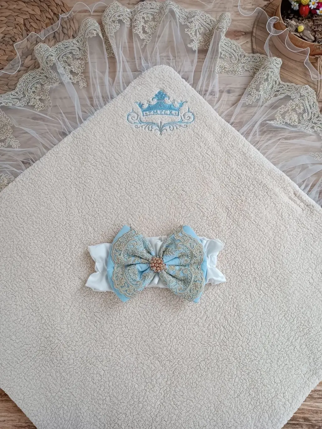 Yenidoğan Kuzulu Taç Nakış Güpürlü Fiyonklu Duvaklı Prizma Taş Unisex Kundak Bebek Battaniyesi