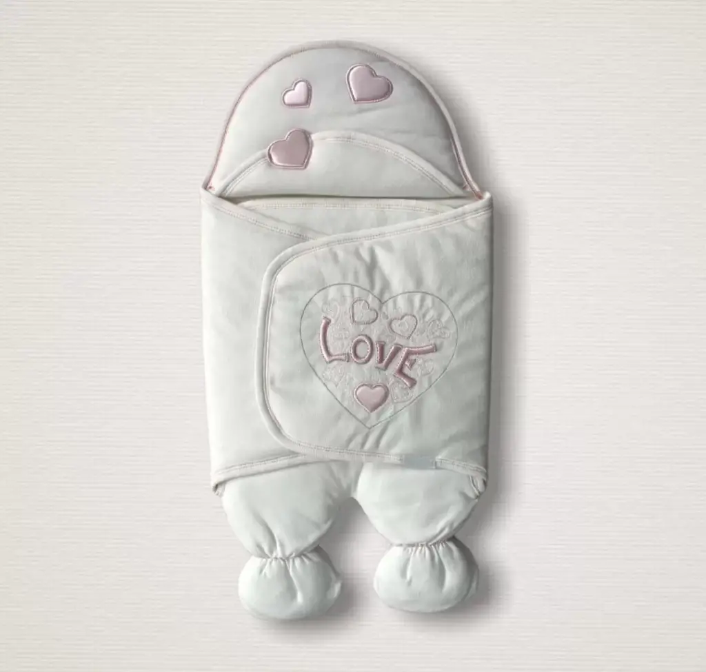Yenidoğan Lüks Üç Kalp Love Nakışlı Kız Bebek Ayaklı Kundak Bebek Battaniyesi