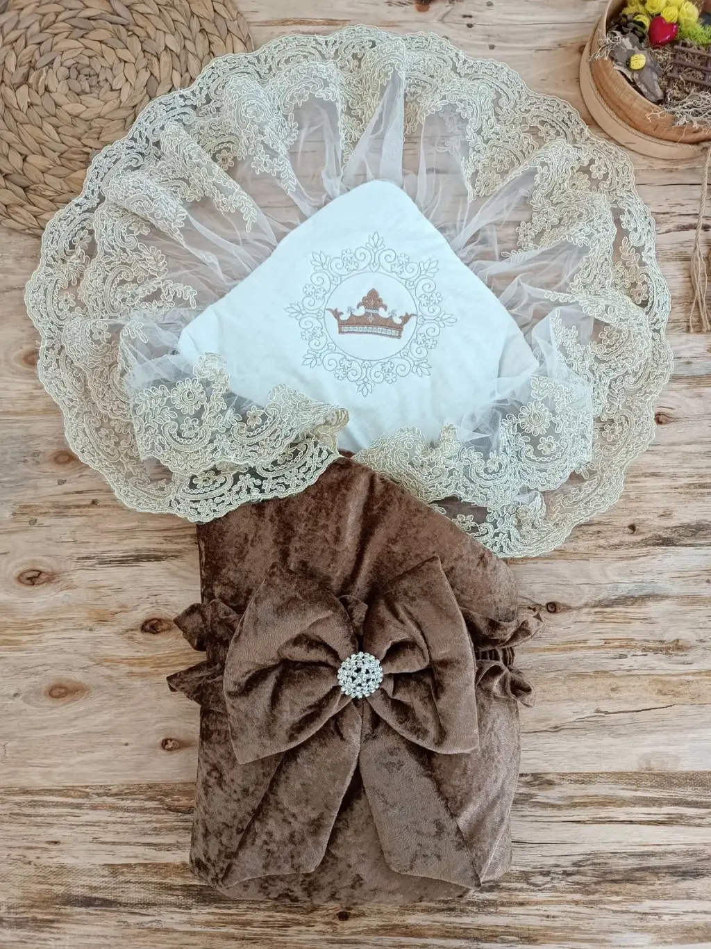 Yenidoğan Saray Kadife Taç Nakışlı İnci Fiyonklu Çift Dantel Duvak Trilüks Kundak Bebek Battaniyesi
