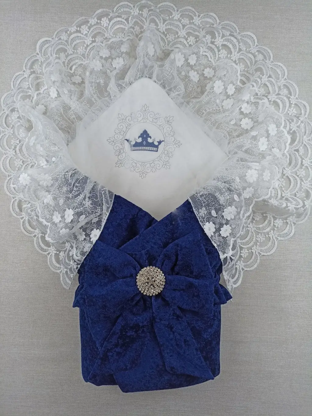 Yenidoğan Saray Kadife Taç Nakışlı İnci Fiyonklu Çift Dantel Duvak Trilüks Kundak Bebek Battaniyesi