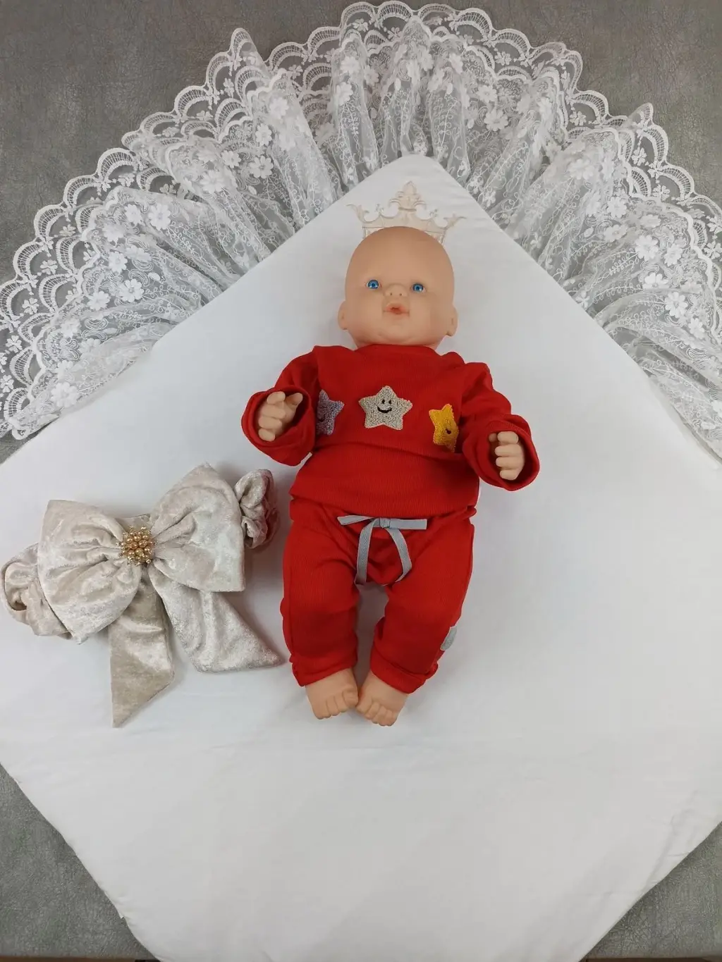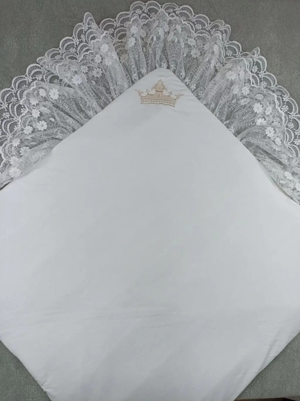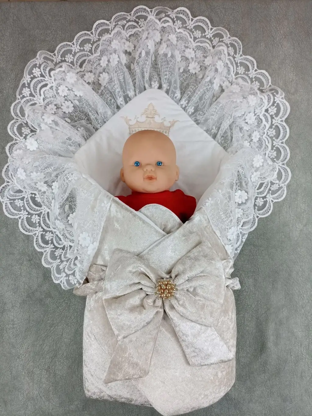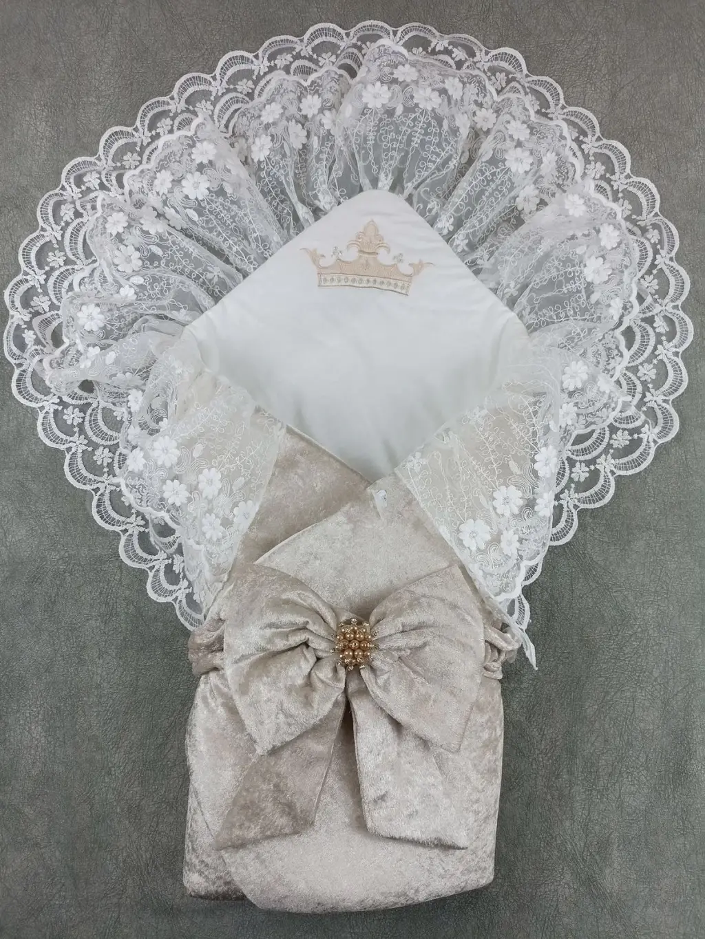 Yenidoğan Saray Kadife Taç Nakışlı İnci Fiyonklu Çift Dantel Duvak Trilüks Kundak Bebek Battaniyesi