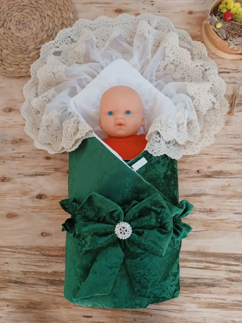 Yenidoğan Saray Kadife Taç Nakışlı İnci Fiyonklu Çift Dantel Duvak Trilüks Kundak Bebek Battaniyesi