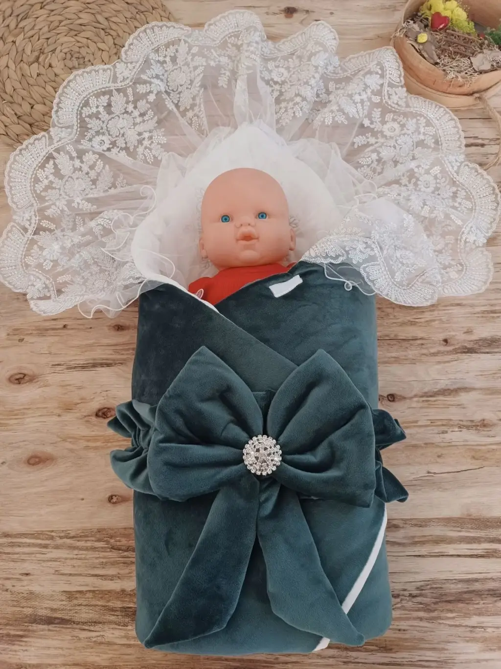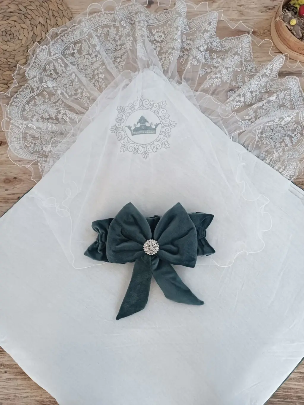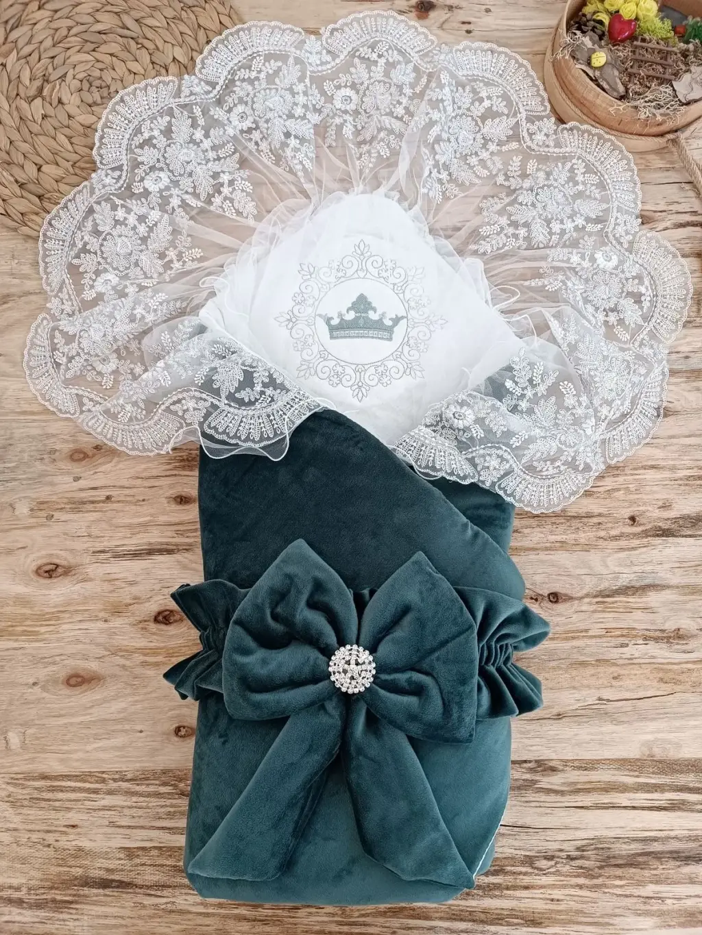 Yenidoğan Saray Kadife Taç Nakışlı İnci Fiyonklu Dantel Duvak Trilüks Kundak Bebek Battaniye