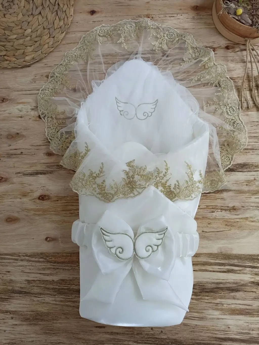Yenidoğan Shine Kumru Melek Kanat Fiyonklu Gold Dantel Duvaklı Delüks Kundak Bebek Battaniyesi