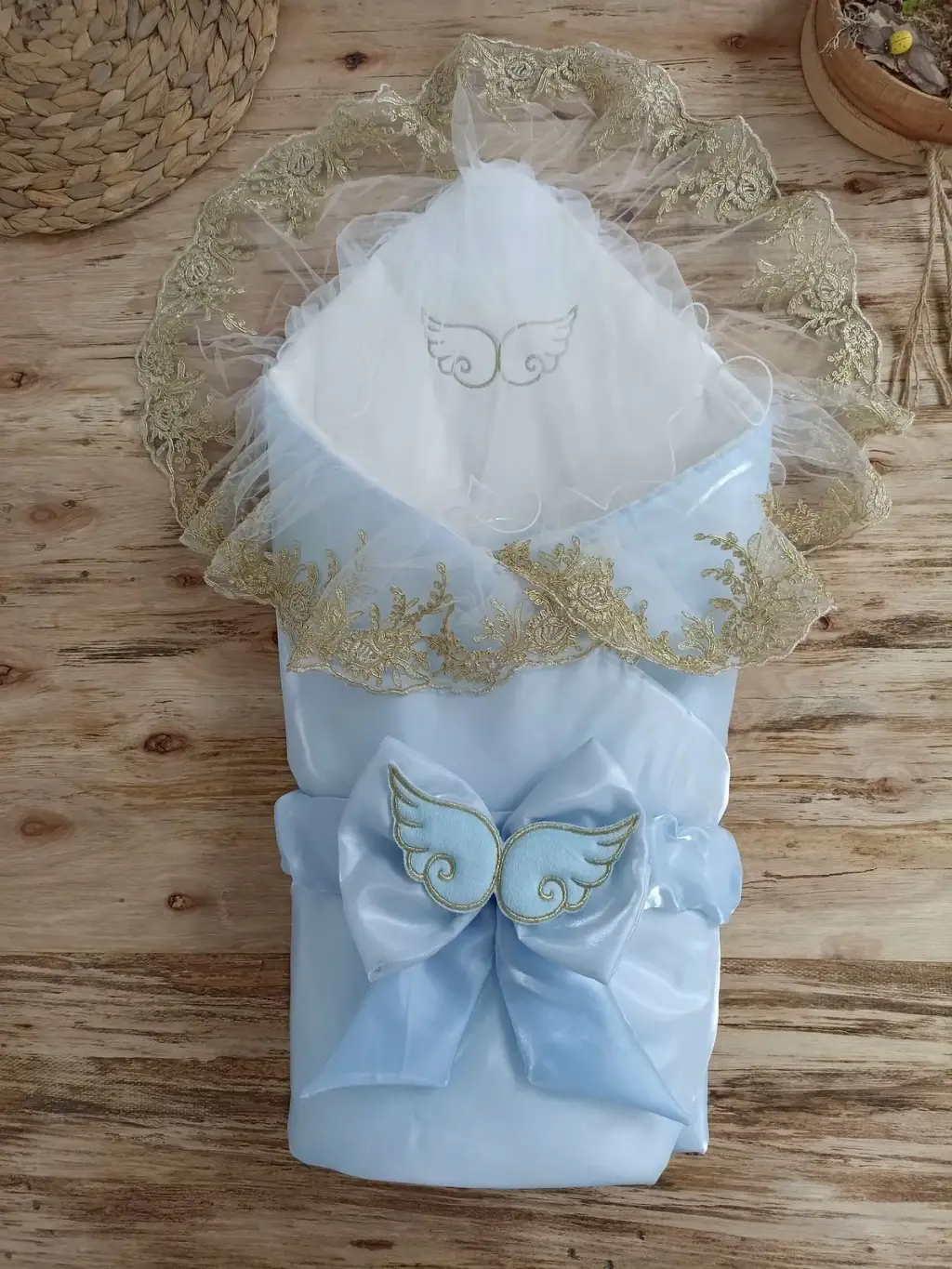 Yenidoğan Shine Kumru Melek Kanat Fiyonklu Gold Dantel Duvaklı Delüks Kundak Bebek Battaniyesi