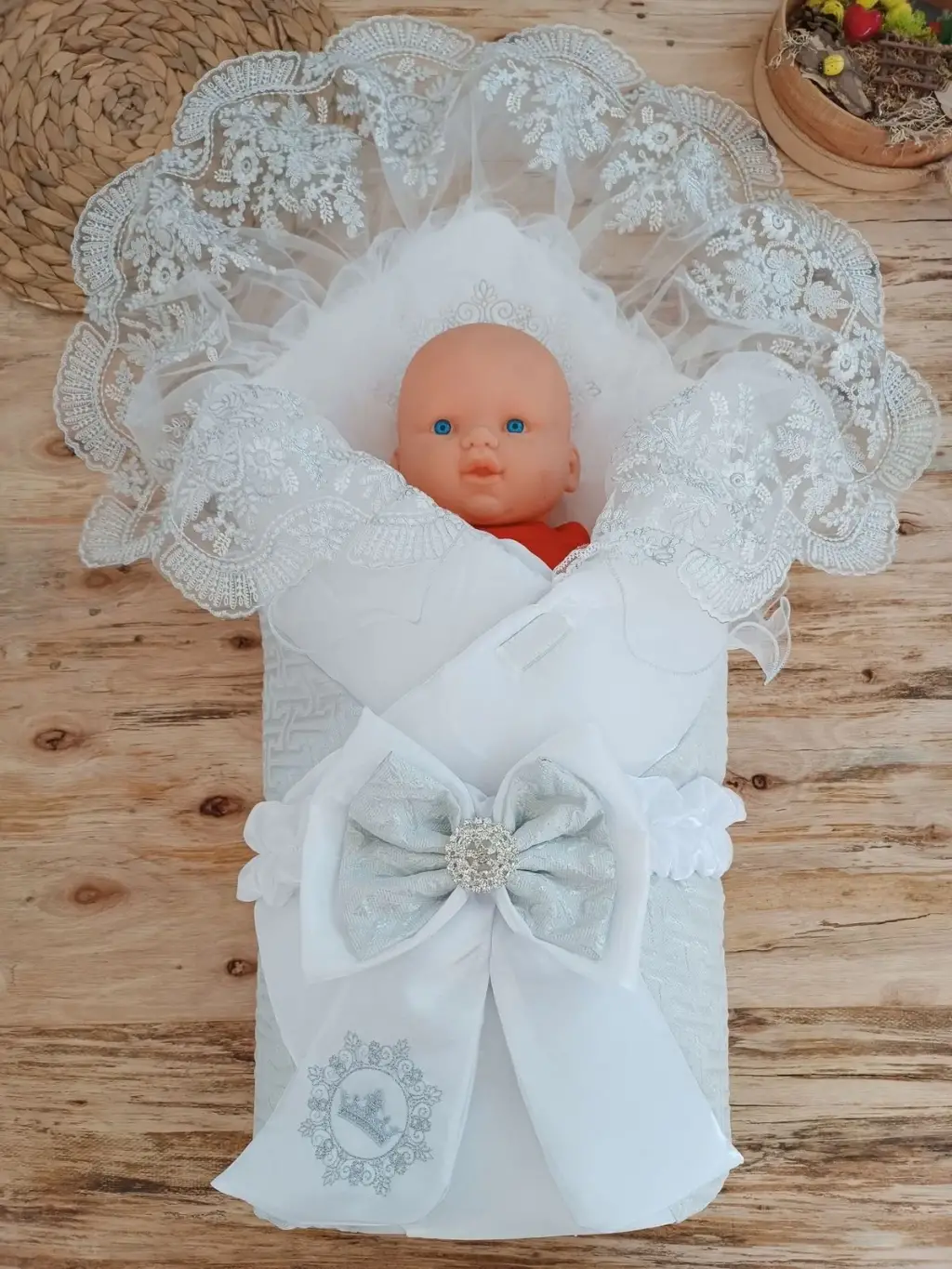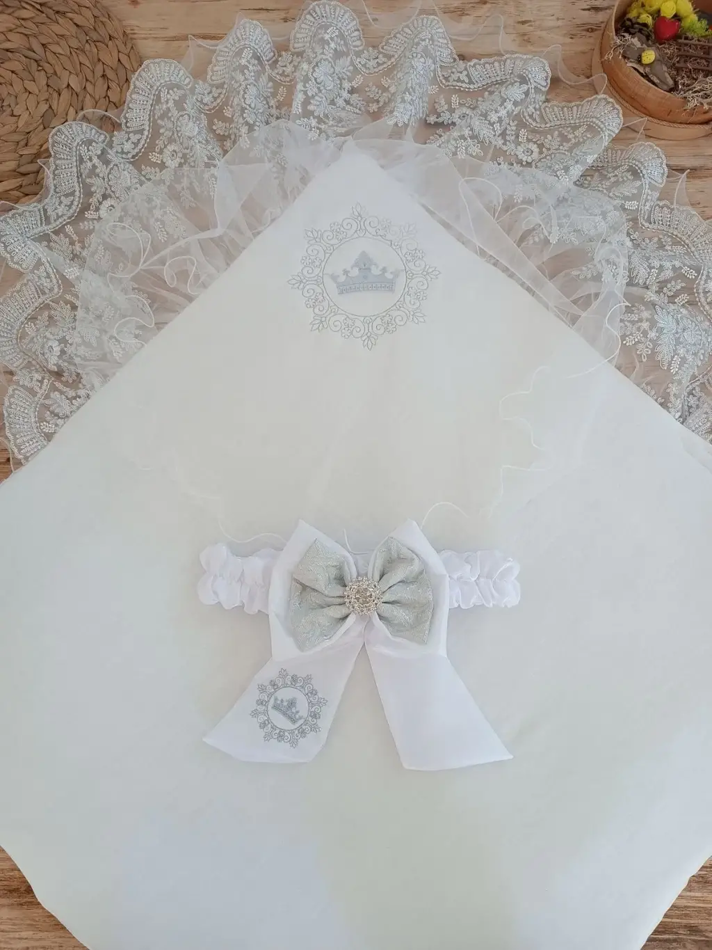 Yenidoğan Titi Taç Nakışlı Plazma Taşlı Güpürlü Çift Fiyonk Duvaklı Trilüks Kundak Bebek Battaniyesi
