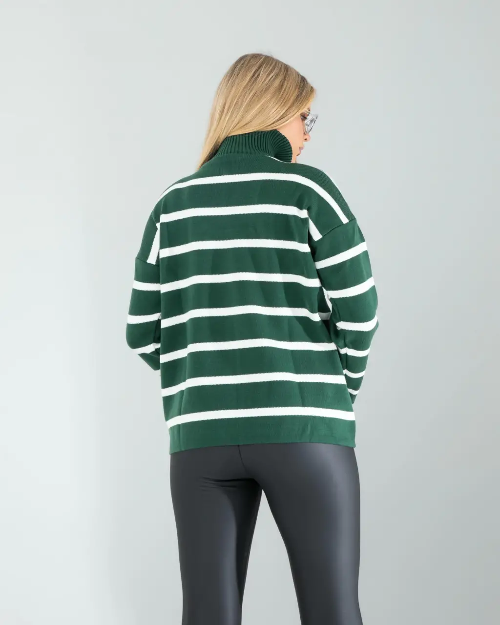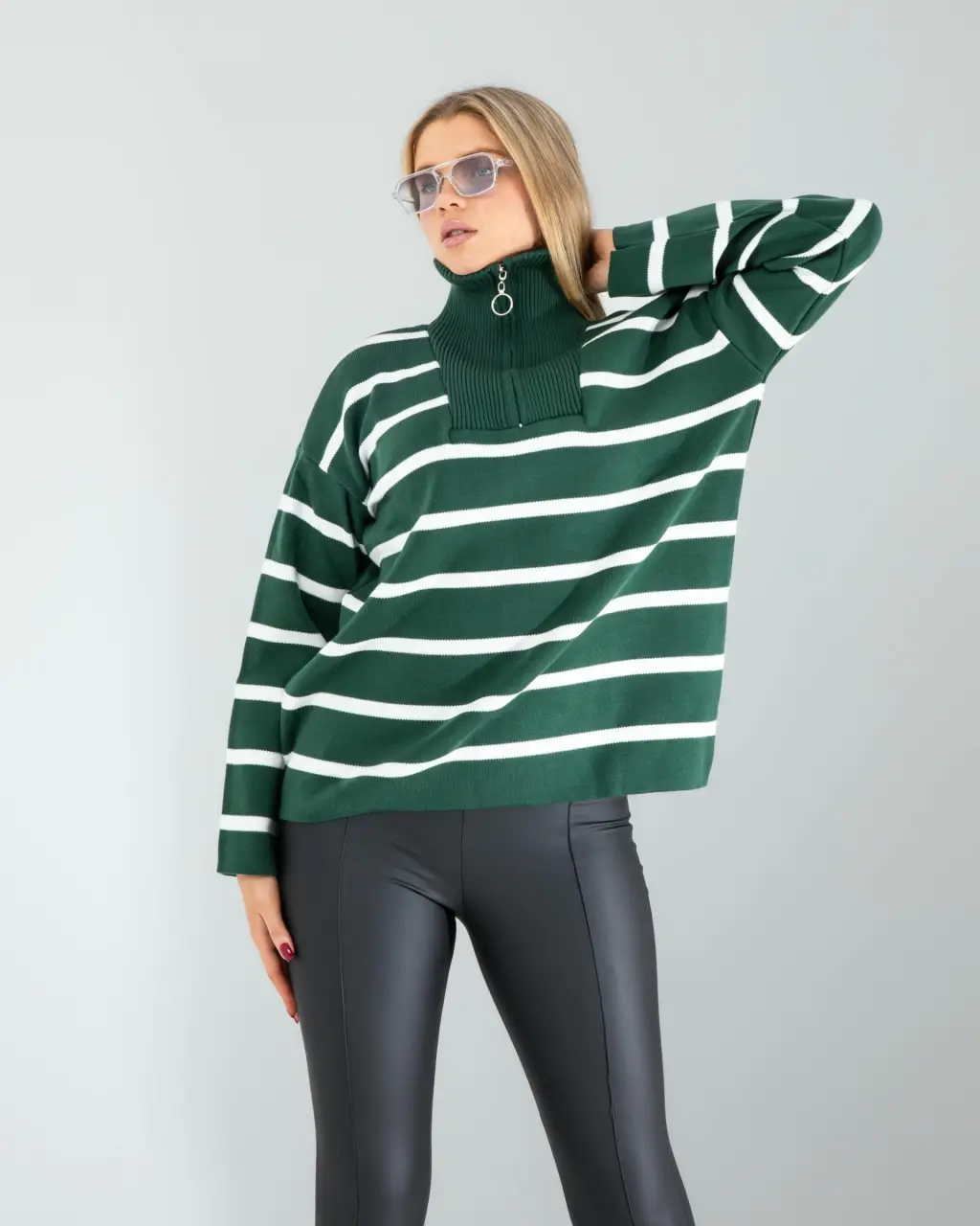 Yeşil Dik Yaka Çizgili Triko Kazak