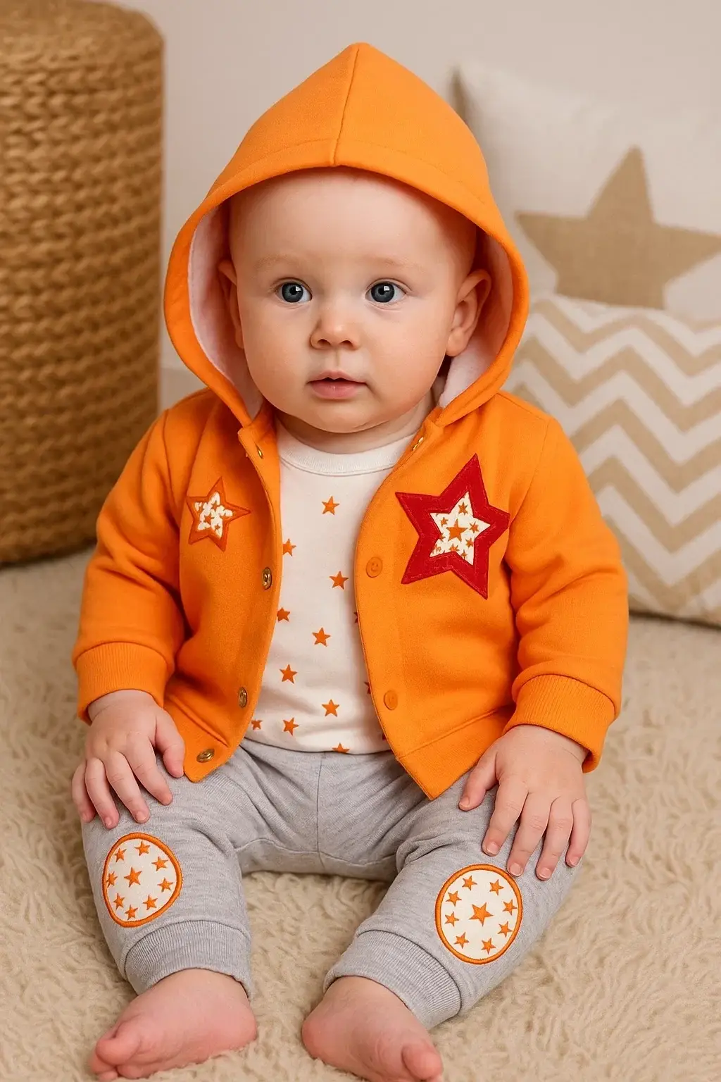 Yıldız Nakışlı Kapişonlu Kız Bebek Takımı