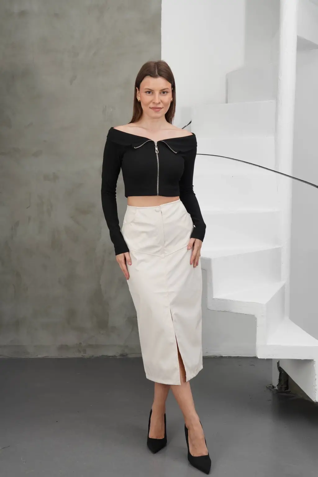 Yırtmaçlı uzun deri etek krem rengiyle gardırobunuza şıklık katacak bir parçadır.