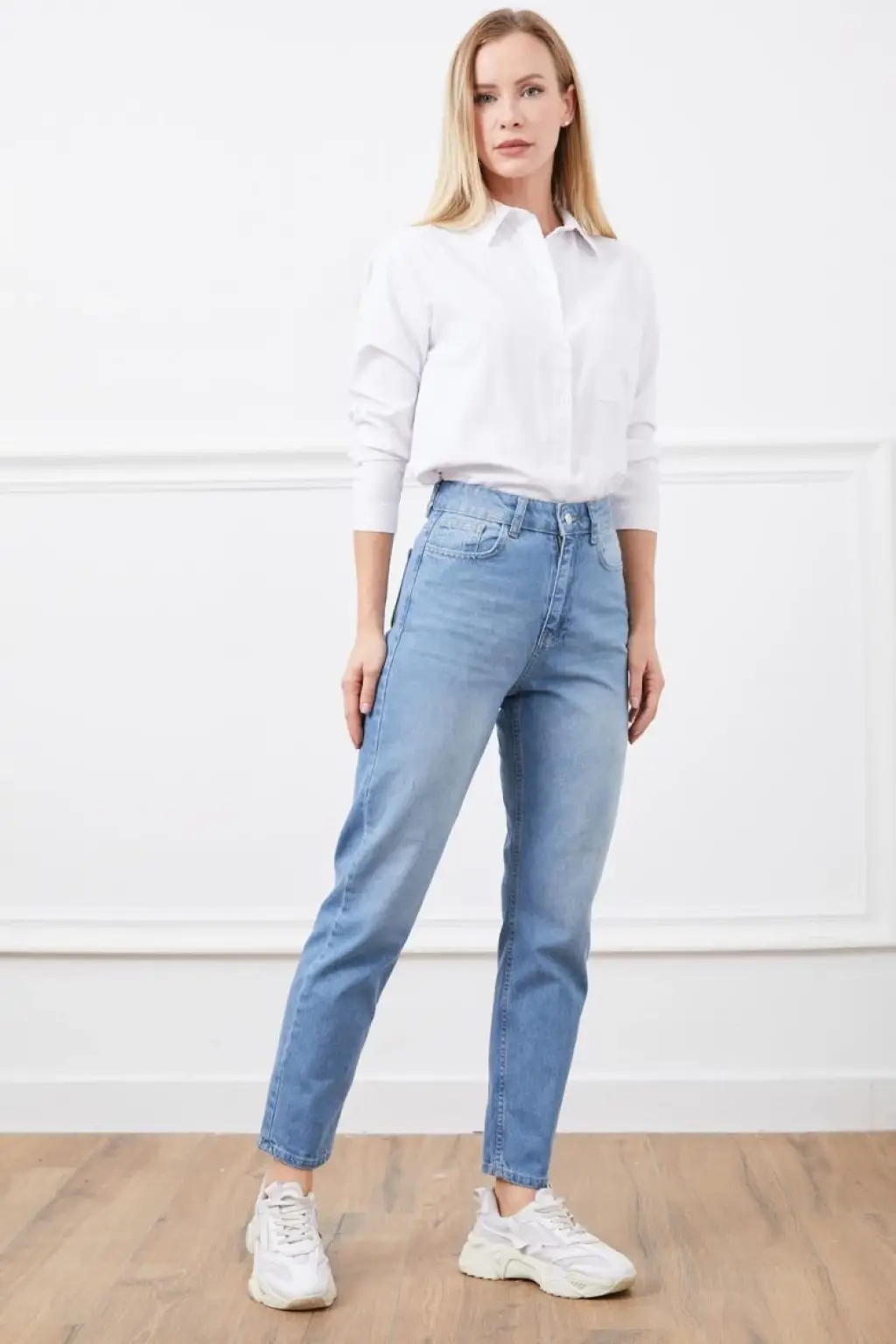 Kadın Yüksek Belli önden Düğmeli Yırtık Detaylı Kot Pantolon